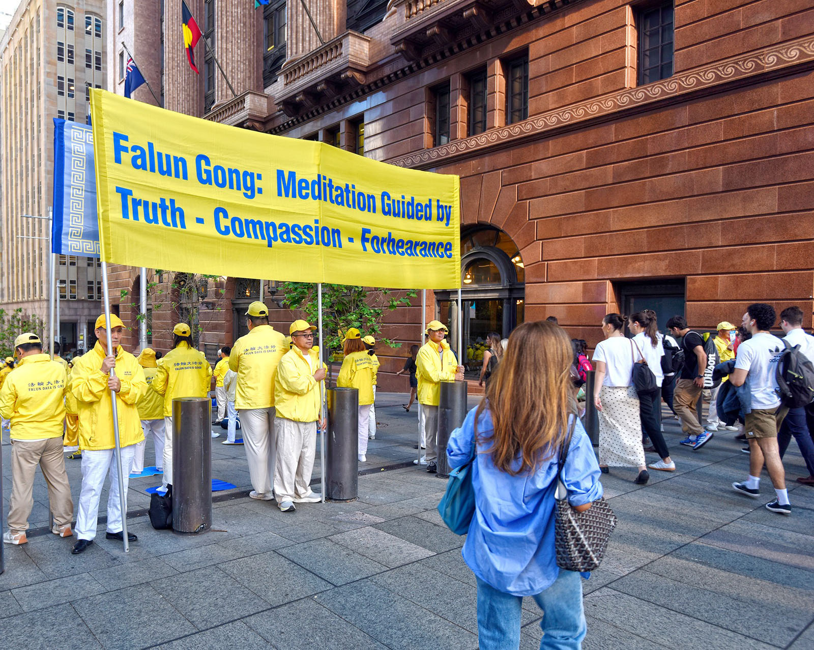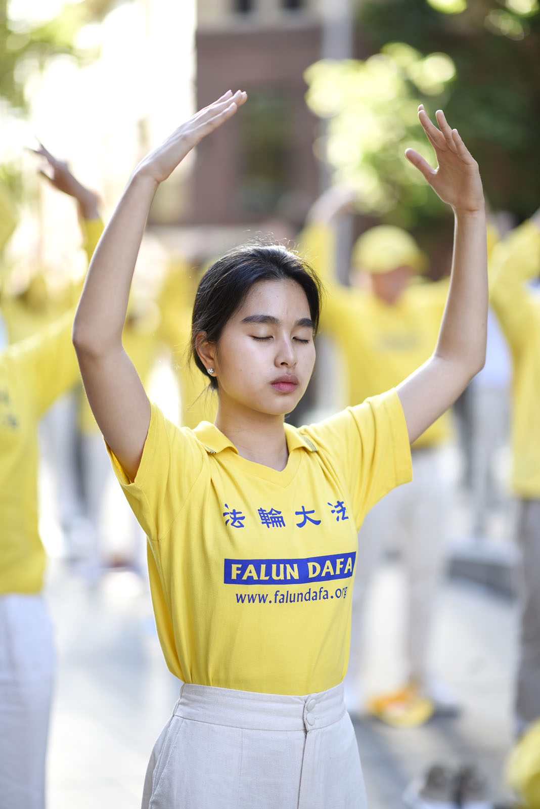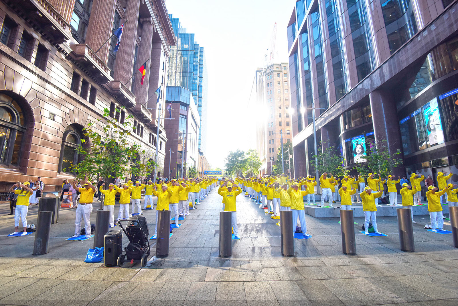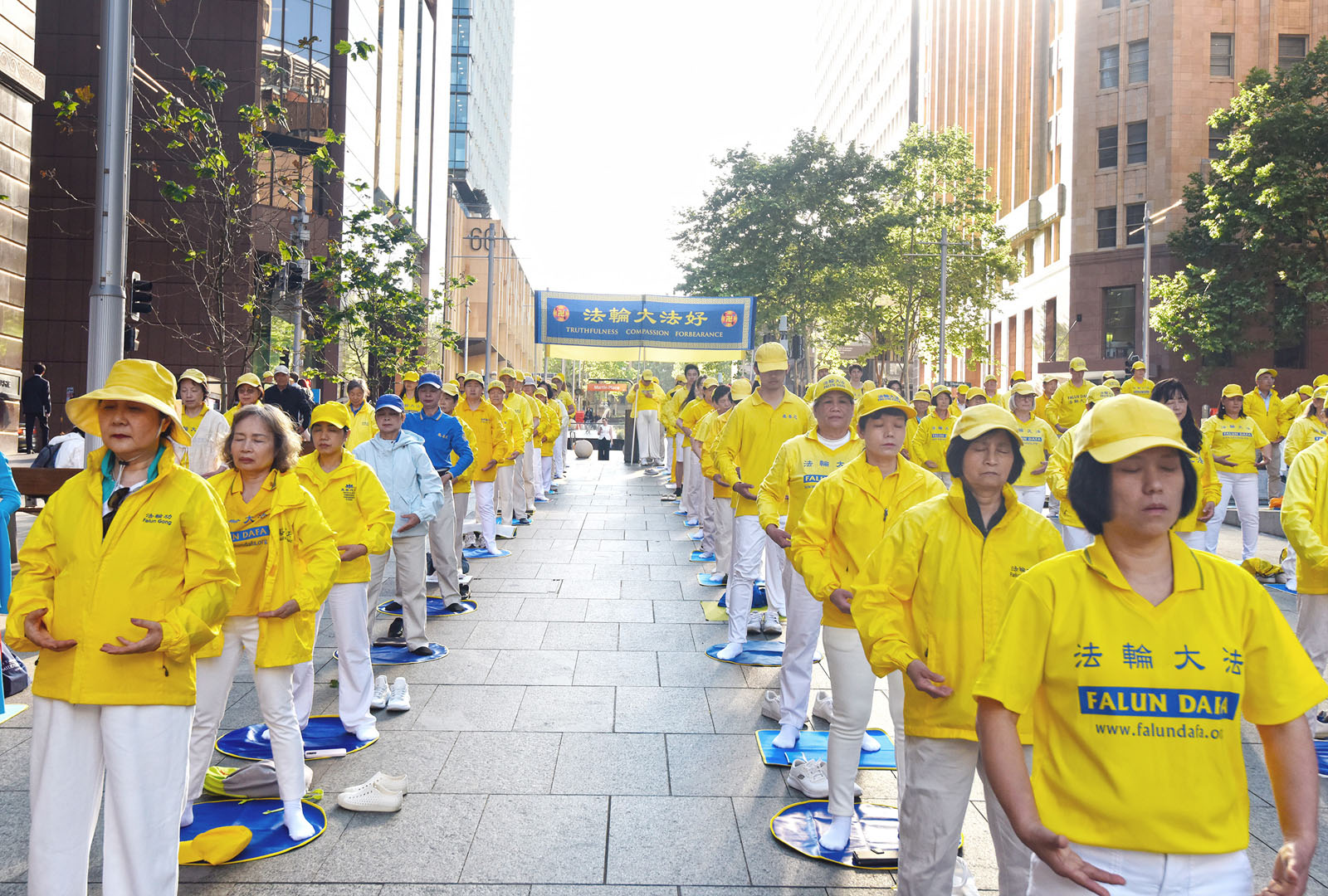 【明慧网二零二五年十月十一日】(明慧澳洲记者站报导)二零二五年十月十日上午,来自全澳各地不同族裔的法轮功学员,在悉尼的“城市心脏”——马丁广场(Martin Place),举行了大型集体炼功活动。