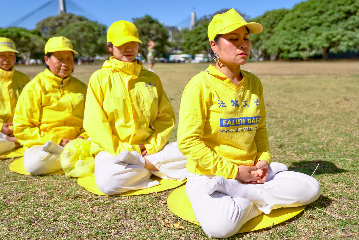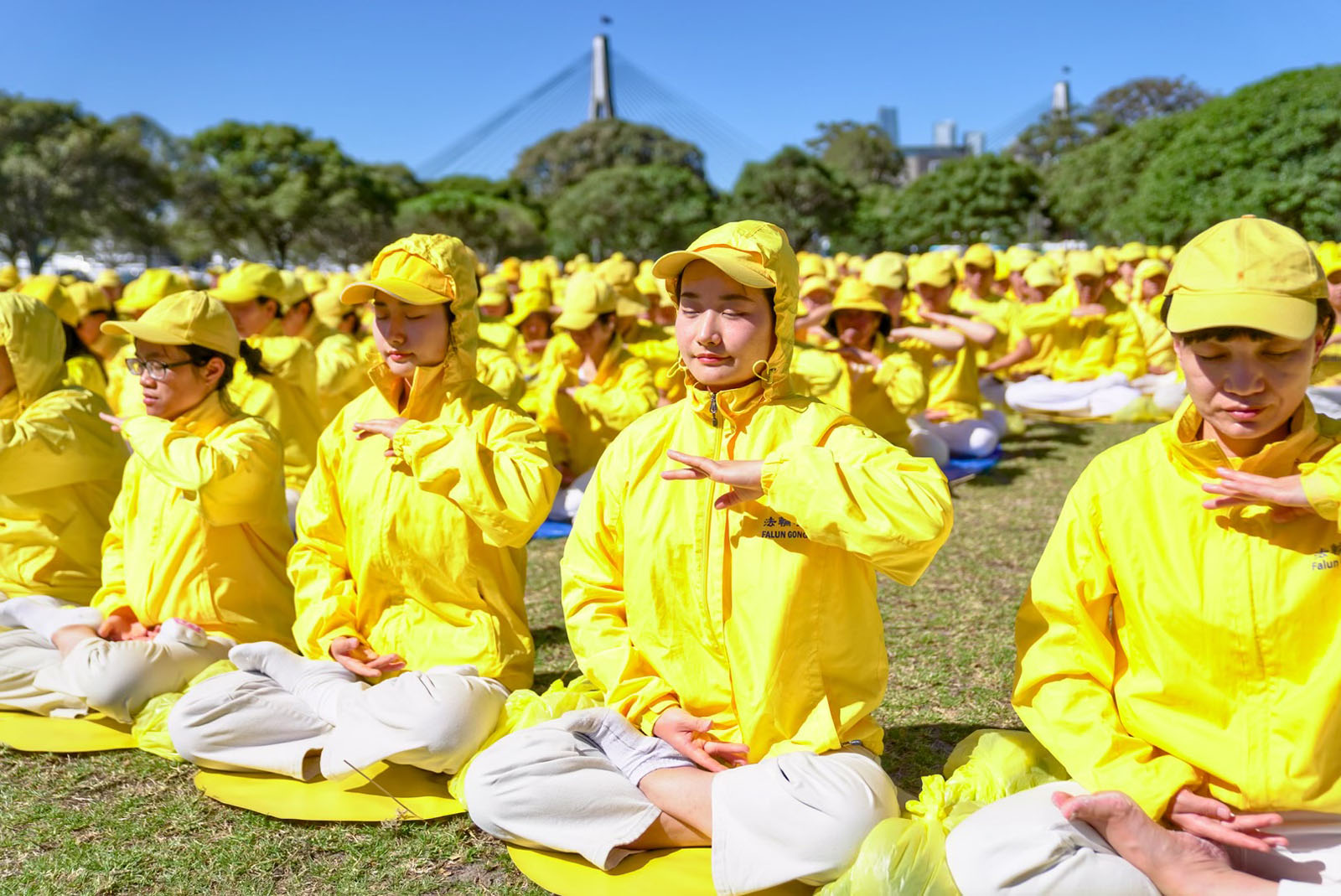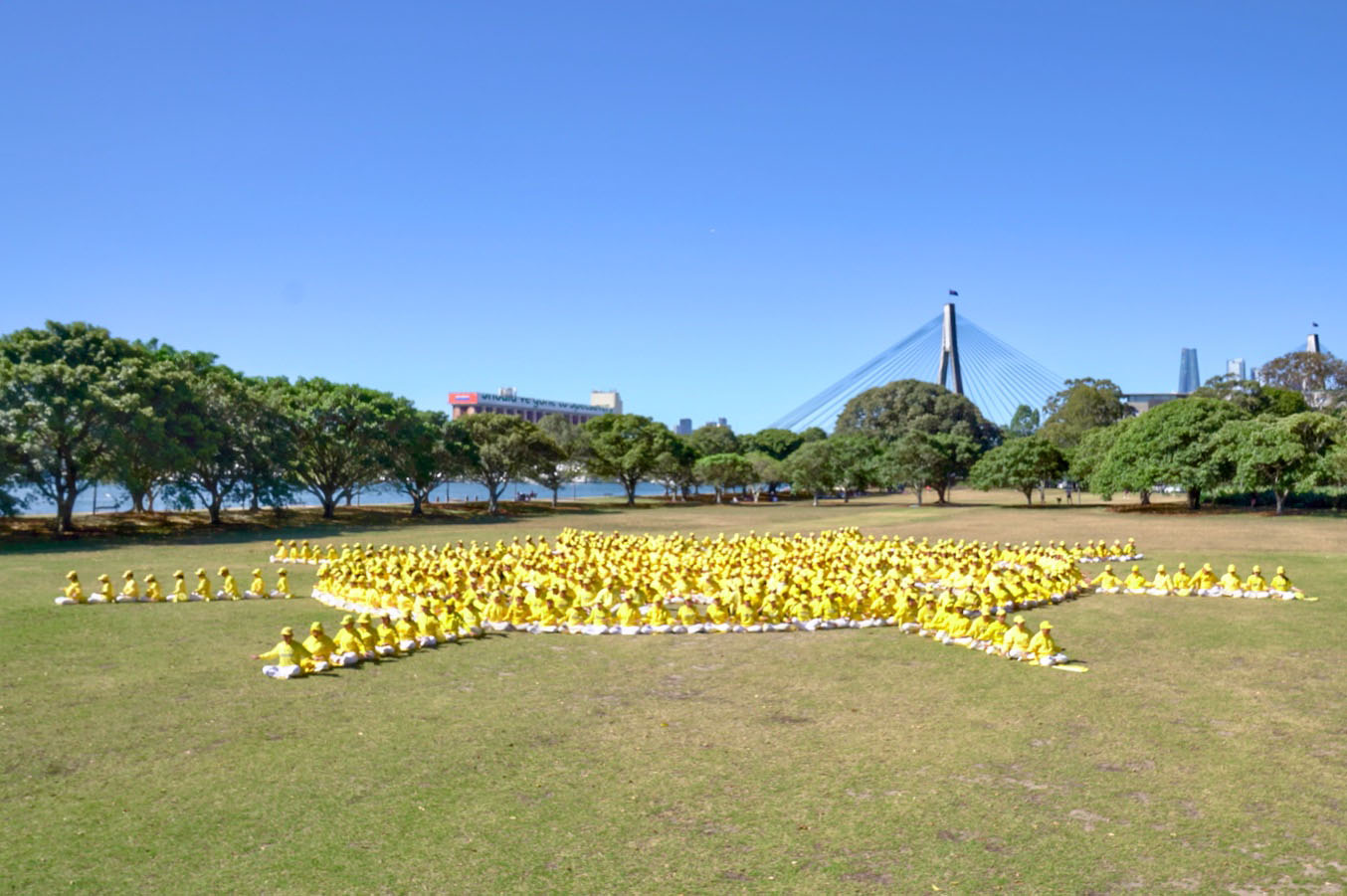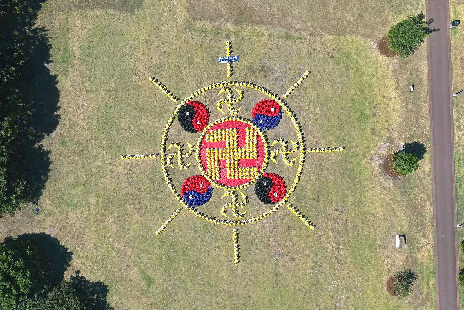 来自澳洲各地的法轮功学员,身穿不同颜色服装,整齐有序地走进场地,排出内径24米的巨大法轮图形,加上金光四射的外围,直径达37米。大法轮由两个上红下黑、两个上红下蓝的太极图和金色的卍字符组成。作为法轮大法的标记,法轮图形也是十方世界宇宙的缩影。从公园上空俯瞰,金色法轮图形在天地间熠熠生辉,十分壮观。