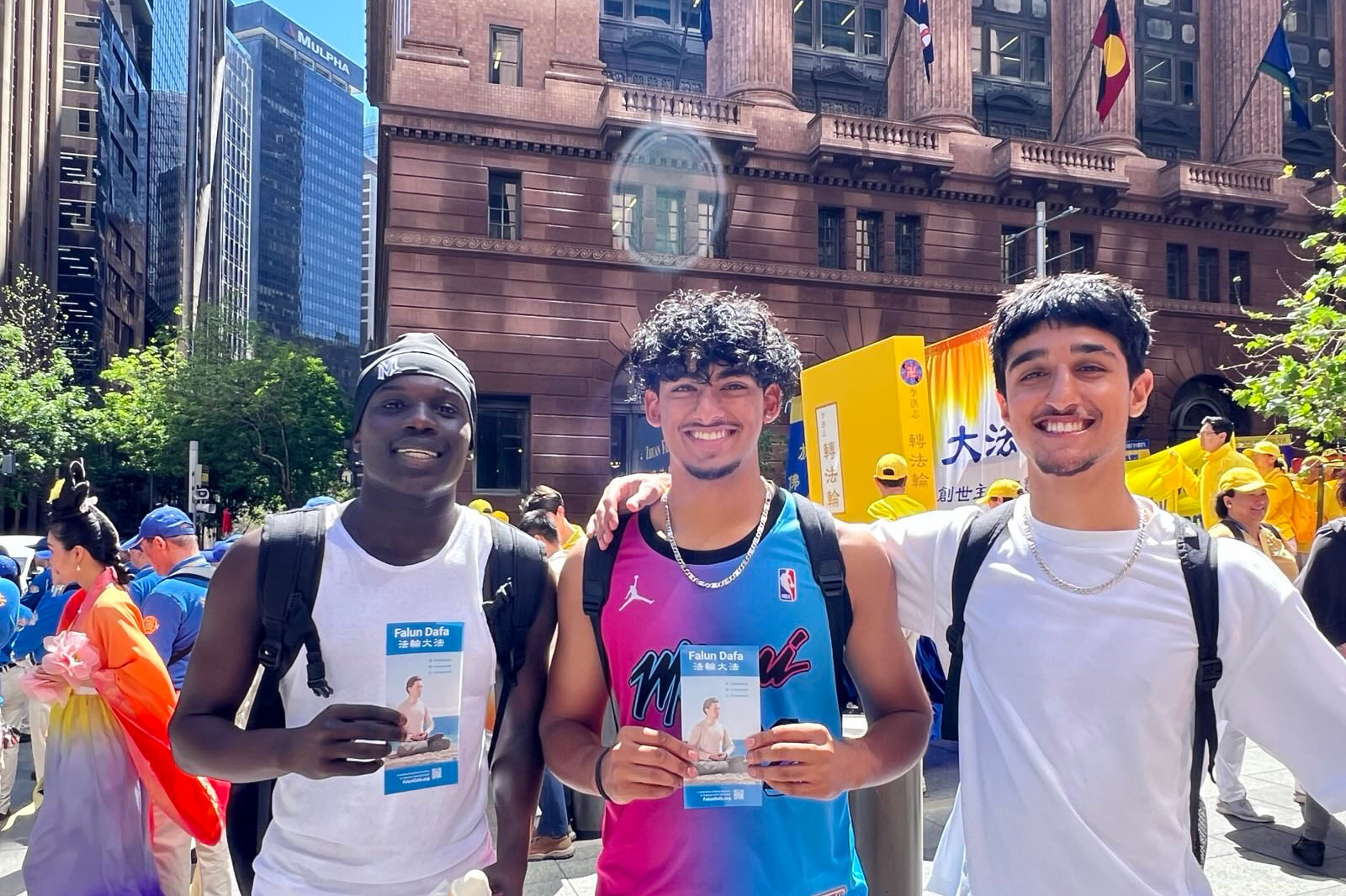 ![]() 图12:十月十一日,学生塔维安·利马(中)和穆罕默德·阿卜杜勒·阿齐兹(右)与同伴在悉尼市中心法轮功学员游行现场合影。 |