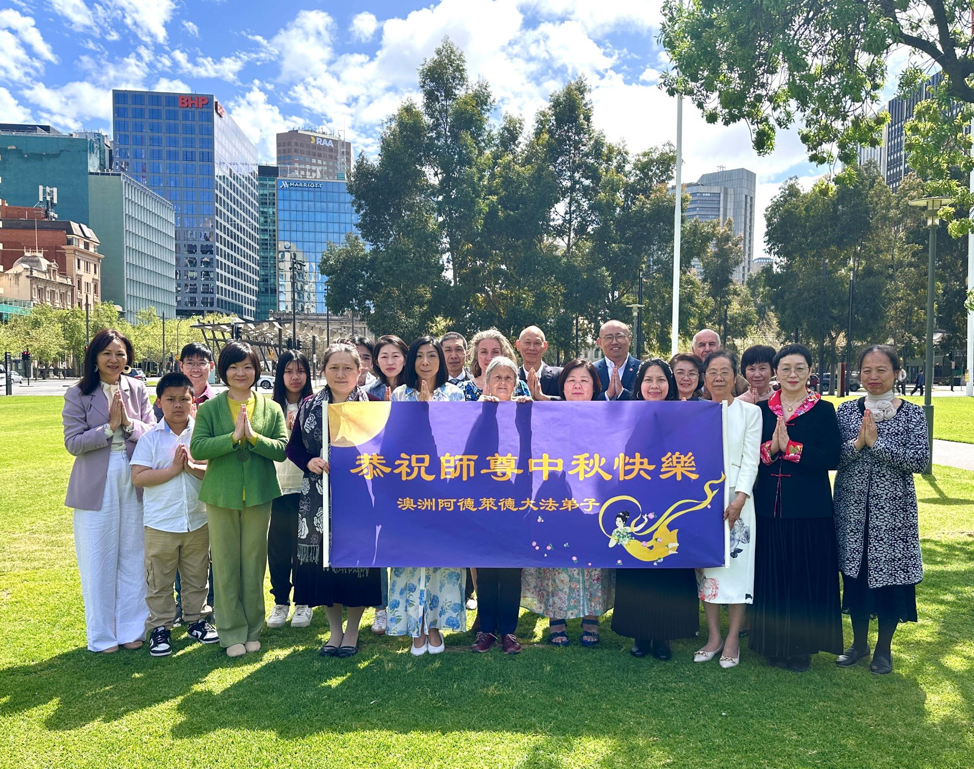 ![]() 图8:澳大利亚阿德莱德中国城真相点的法轮功学员恭祝师尊中秋佳节快乐 |