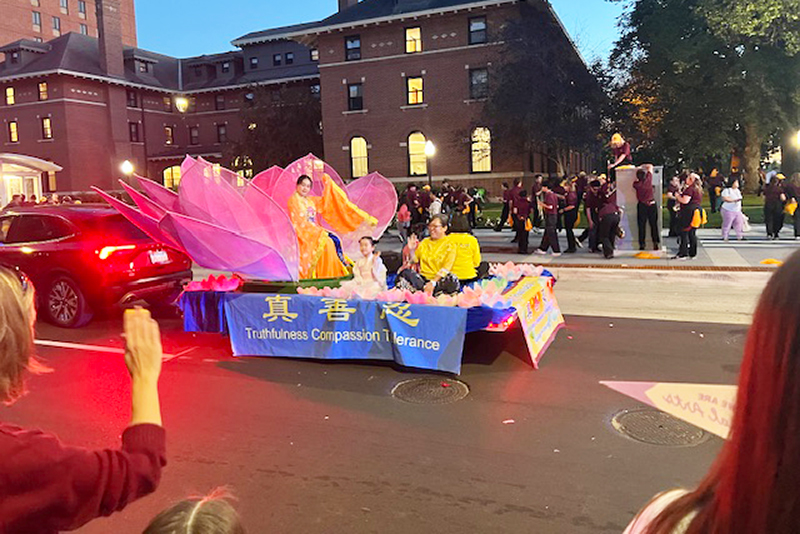 华灯初上,返校日游行于傍晚六點半开始。法轮功俱乐部队伍在优雅的《普度》音乐声中缓缓前行,巨大的粉色莲花花车上,身着汉服的小女孩和唐装的仙女热情的和观众招手,花车前后有俱乐部成员拉着法轮功的横幅,花车两旁还有学员给沿街观众赠送小莲花和书签。俱乐部成员们美丽祥和的姿态受到了沿街观众的赞叹。