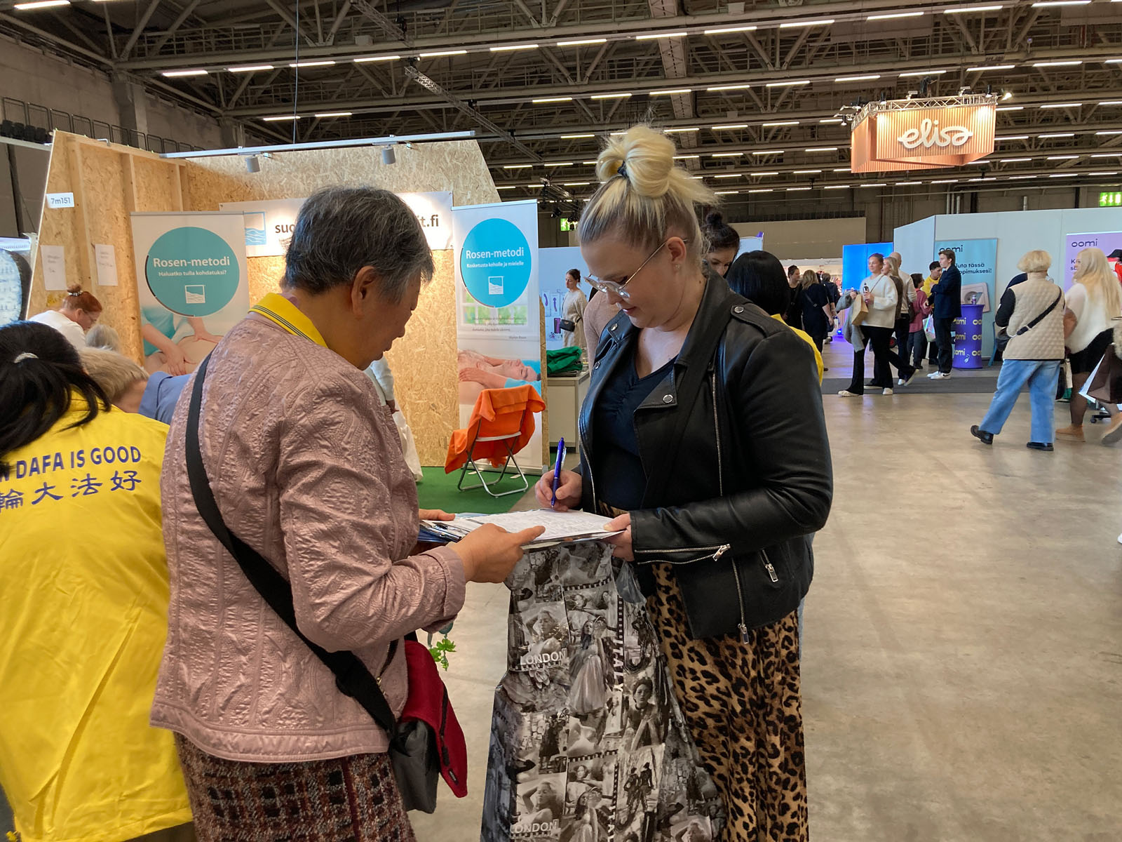 【明慧网二零二五年十月二十二日】二零二五年十月十七日至十九日,“我爱我2025”的健康展在芬兰赫尔辛基会展中心(Messukeskus)举行。本次展会汇集了美容、时尚和健康领域的最新趋势。芬兰法轮功学员也应邀参加,并向民众介绍法轮大法对人身心受益,以及被中共残酷迫害的真相,展位吸引了许多观众的关注,有不少人现场学起功来。