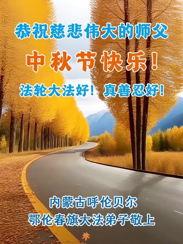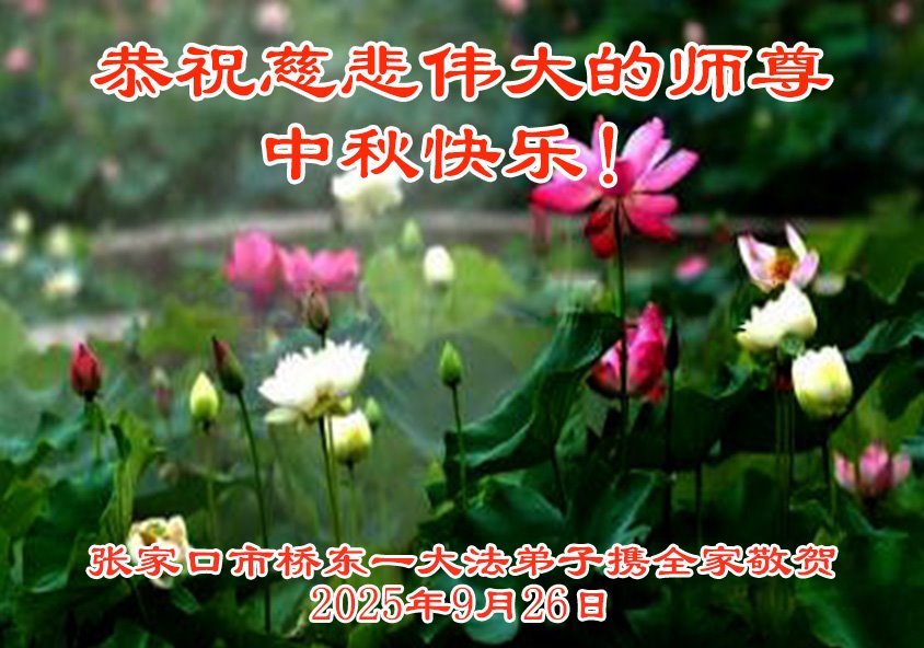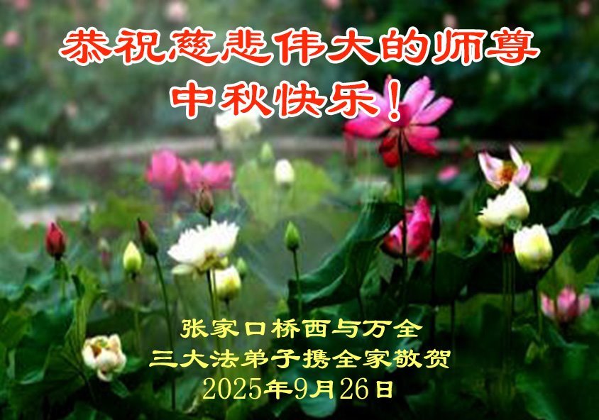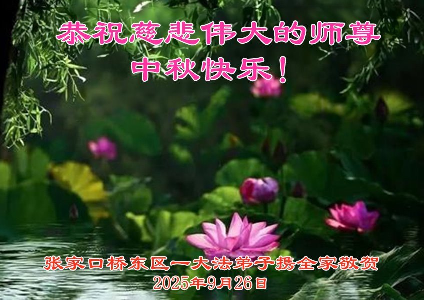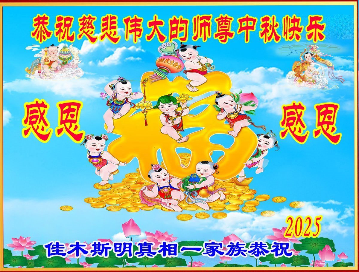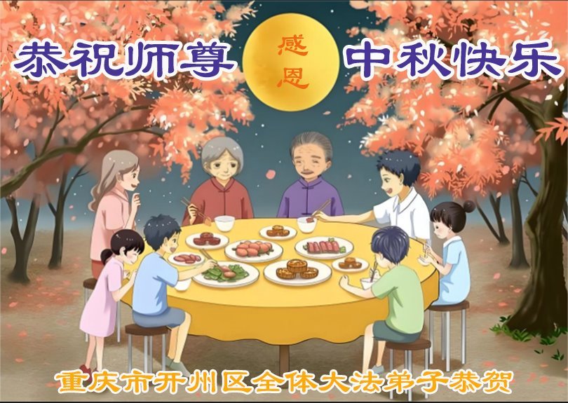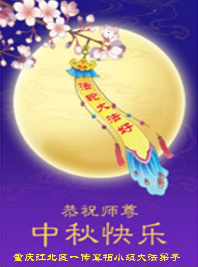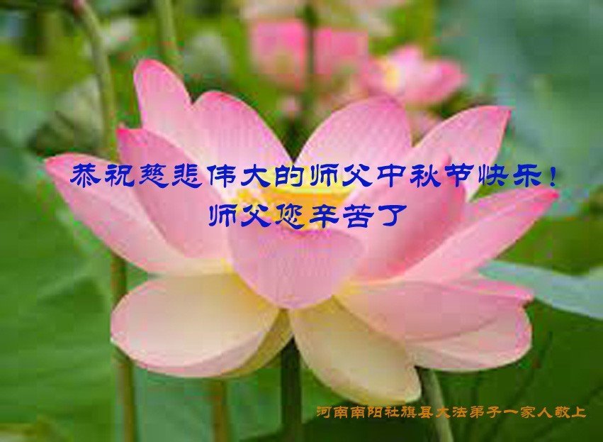 我们大法弟子携家人和明真相的世人恭祝师尊中秋节快乐!师尊辛苦了!谢谢师尊的慈悲苦度!弟子一定破除旧势力的安排,消除间隔,形成强大的整体,反迫害,救度众生。弟子们要多学法,学好法,发好正念,向内找,兑现自己的誓约,跟师父回家。