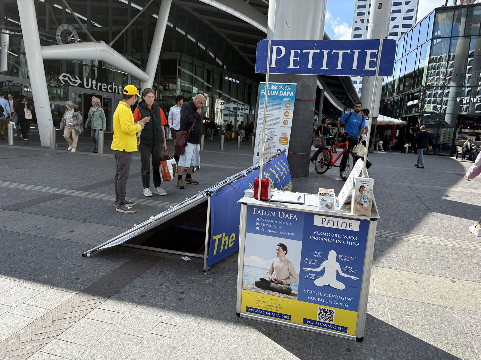 二零二五年九月十四日,成百上千人路过乌得勒支中央火车站外法轮功学员的信息亭。许多人驻足阅读横幅上的内容,并与法轮功学员交谈,有很多人第一次了解到这场迫害。