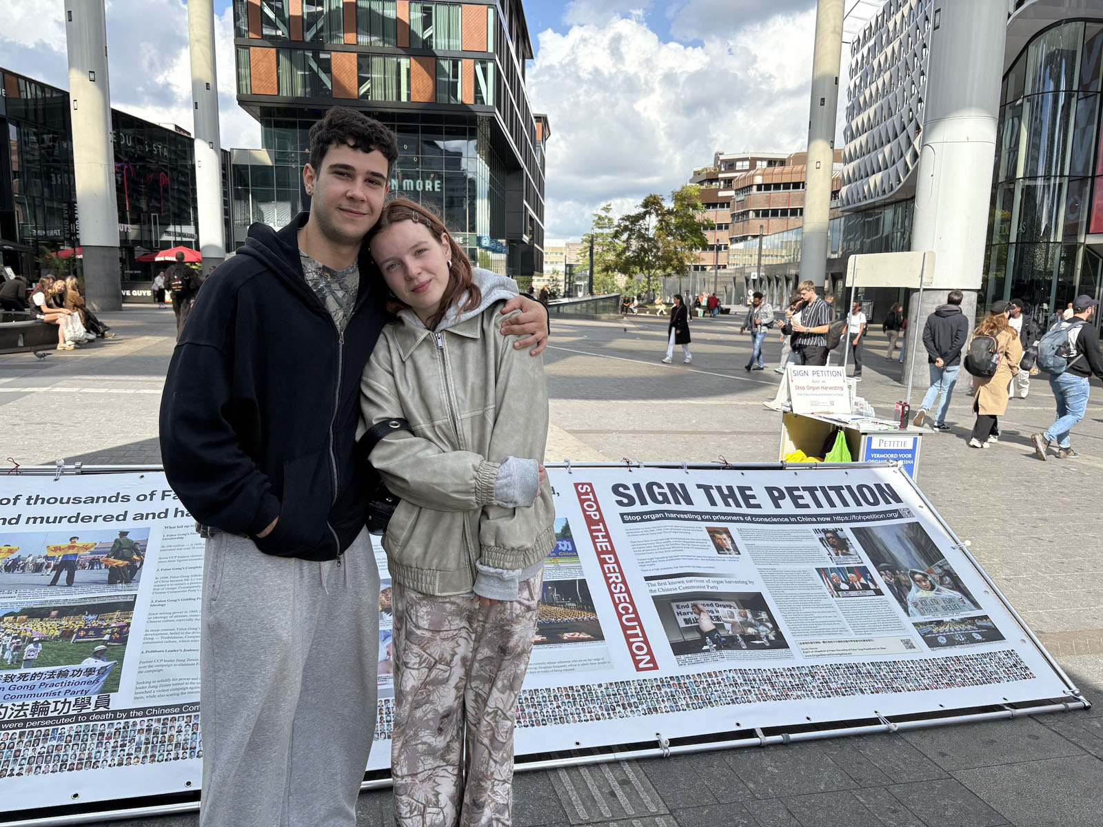 在众多驻足了解真相的路人中,有三位来自爱尔兰都柏林的年轻人,乔克·史密斯(Jock Smith)、萨莎·奥卡罗尔(Sacha O’Caroll)和伊恩·但丁(Ethn Dante)在阅读了横幅上的信息并与法轮功学员交谈后,他们在呼吁制止中共活摘法轮功学员器官的请愿书上签了名。