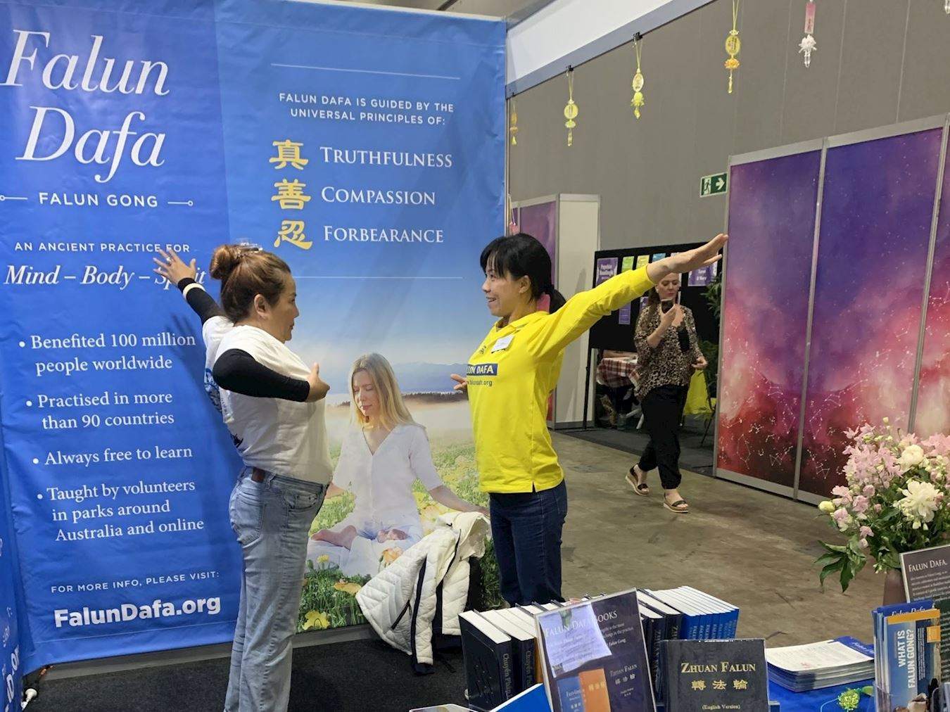 '图1~5:二零二五年十一月十四日至十六日,法轮功展位在墨尔本身心灵健康展期间吸引观众驻足,了解详情,学习五套功法。'