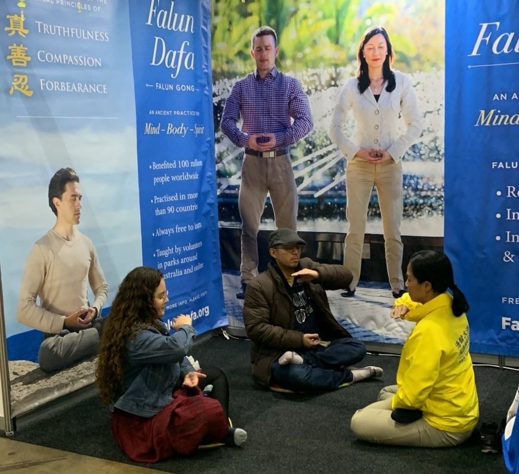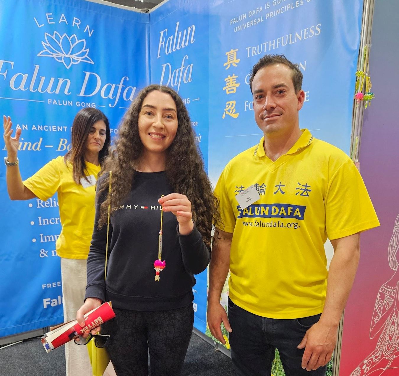 学员们分享,很多人渴望找到属于自己的修行之路,在交谈过程中不少观众都说,真、善、忍理念是当今世界所需,并能感受到法轮功展位周围有很强大的能量,希望法轮大法能在灵性上指引他们。