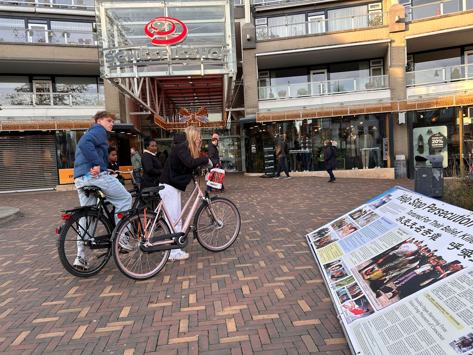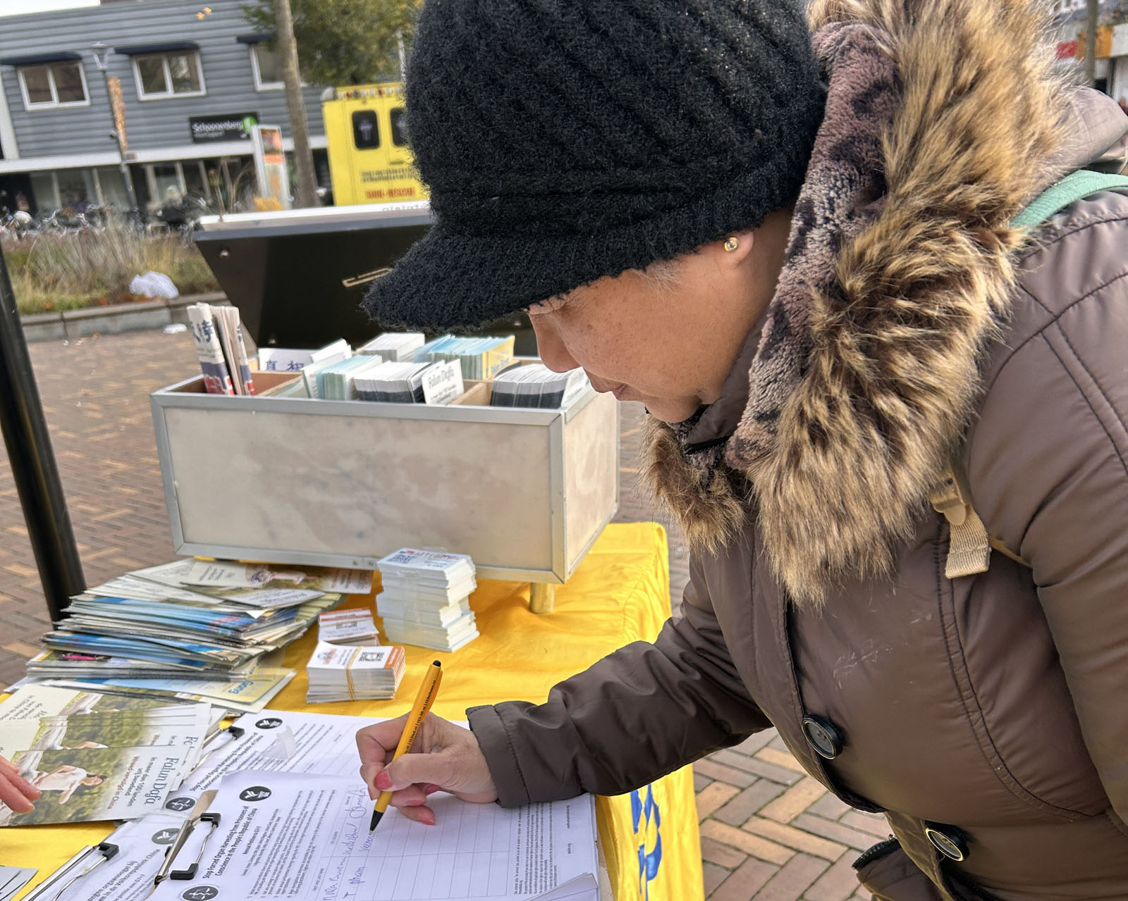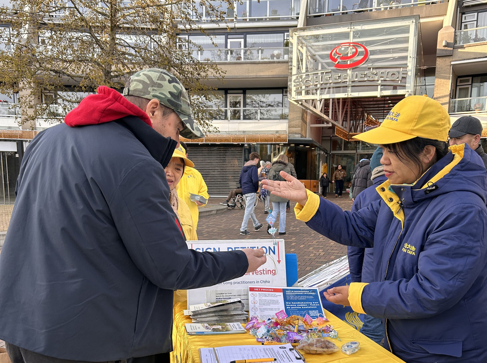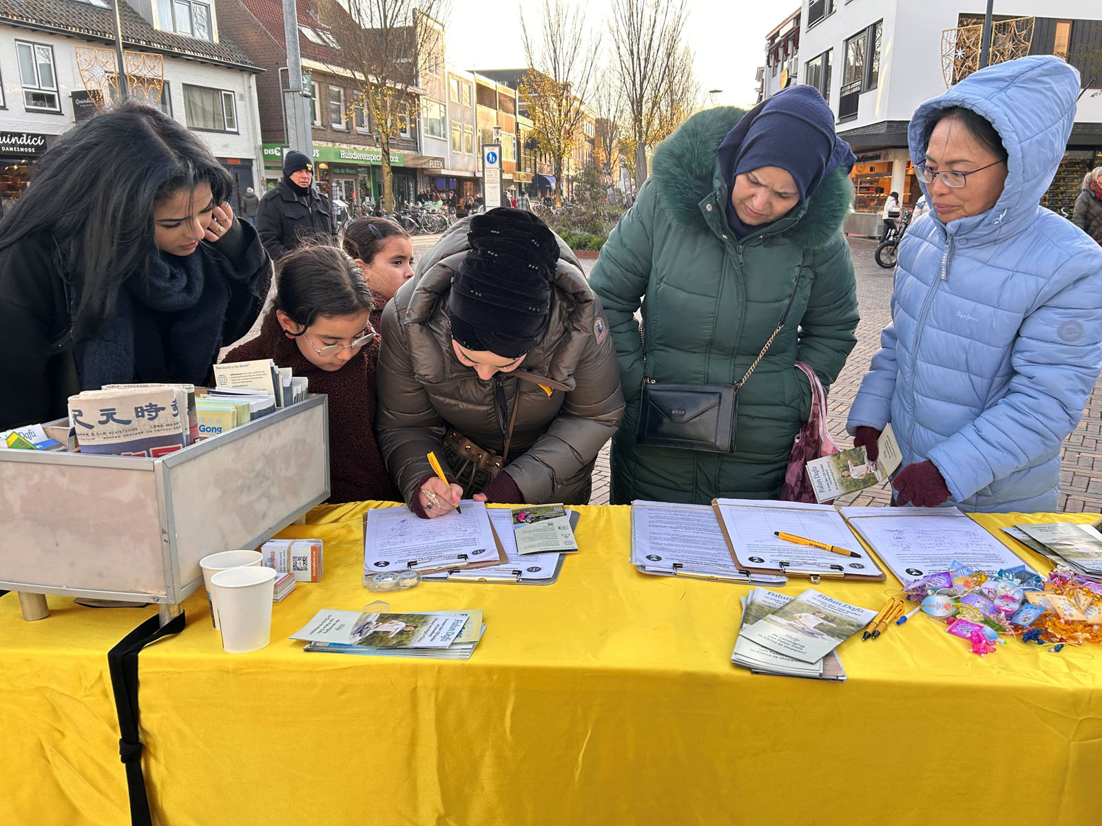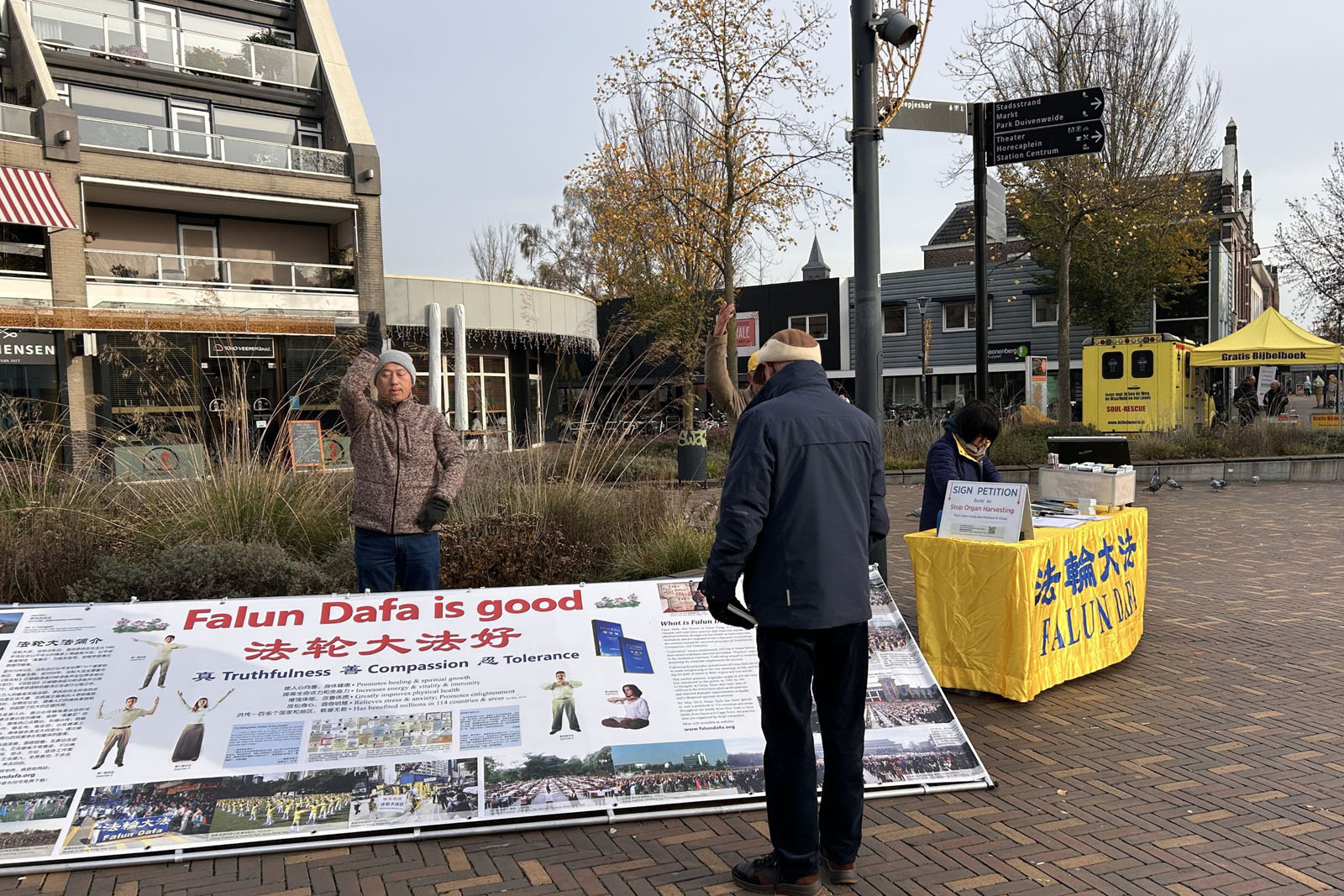 二十二日中午,法轮功学员们在费嫩达尔的高街(Hoogstraat)布置法轮功真相展板,演示法轮功五套功法,向路人发送传单,讲述法轮功在中国遭遇中共长达二十六年的迫害。人们在反对中共活摘法轮功学员器官的征签表上签名,支持法轮功反迫害。
