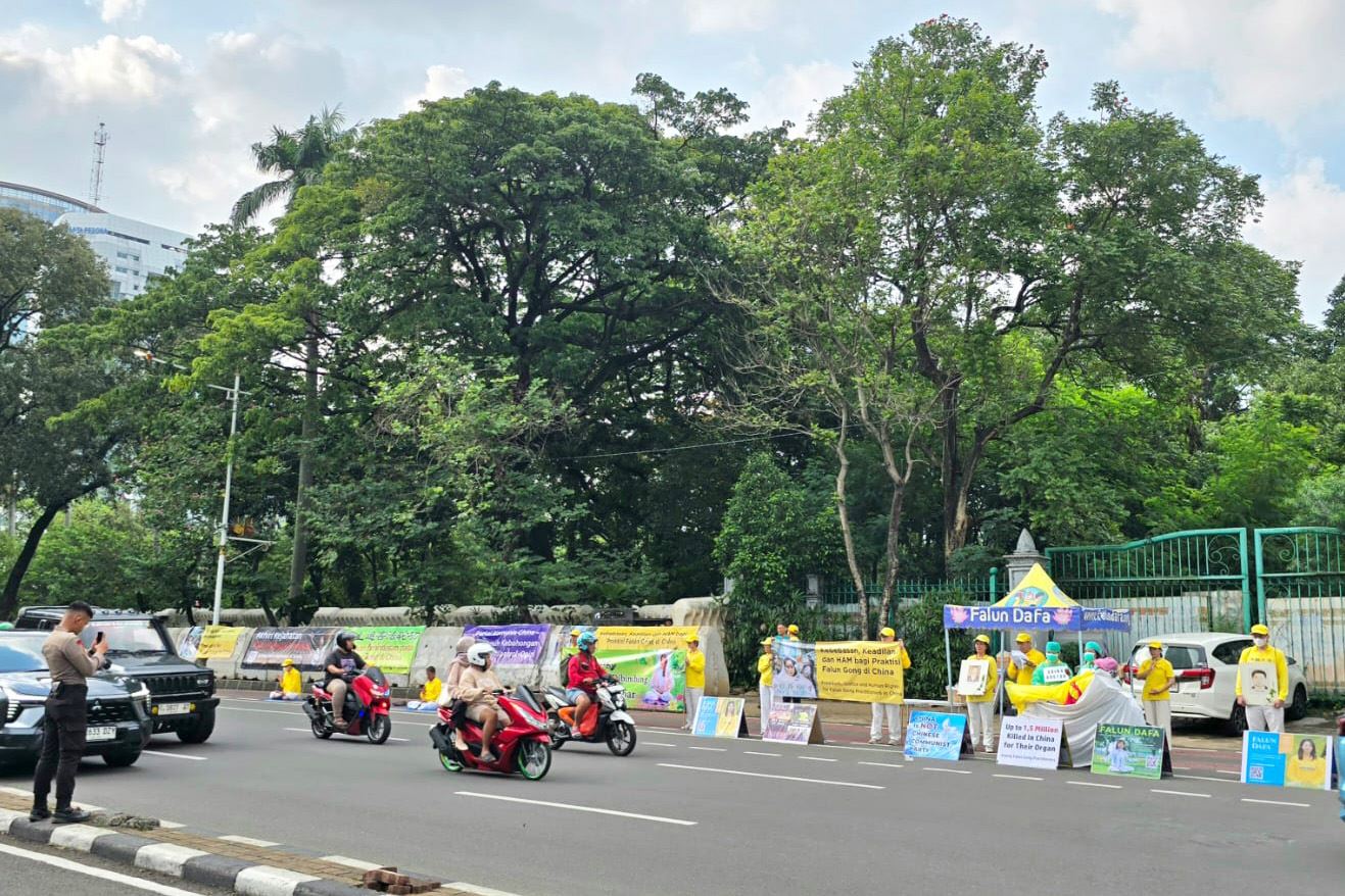 二零二五年十二月十二日,印尼东爪哇省省会泗水市的部分法轮功学员在泗水中领馆前举行集会。学员们手持反迫害横幅,向路人发传单,并讲述中共迫害法轮功的真相。
