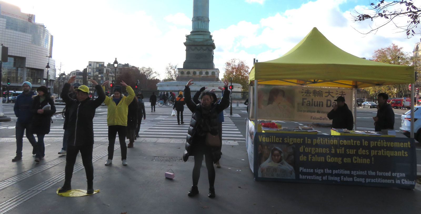 ![]() 图1~3:十一月三十日星期日上午,法轮功学员在巴黎巴士底广场举行了弘法讲真相活动。 |