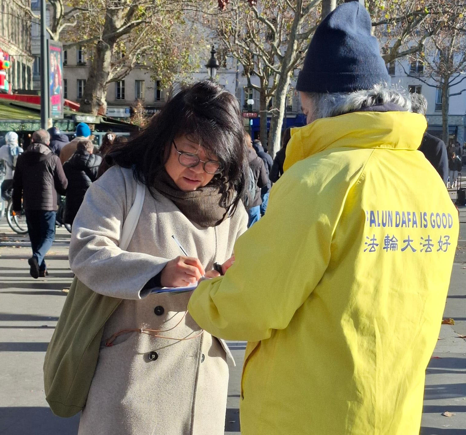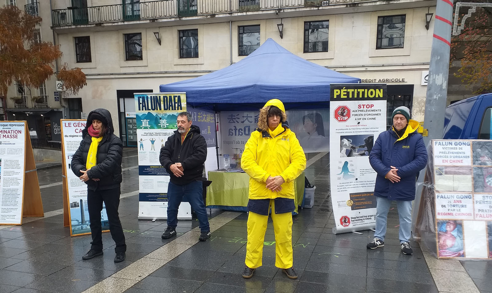 十一月二十九日下午,在亚棉的阿尔方斯·菲凯广场(Place Alphonse Fiquet)广场,法轮功学员进行了讲真相和征签活动。正赶上这里的圣诞市场开启,来往的行人很多。尽管下着小雨,人们认真倾听法轮功学员的讲解,几乎所有听到真相的人都在反活摘征签表上签字,希望停止迫害。