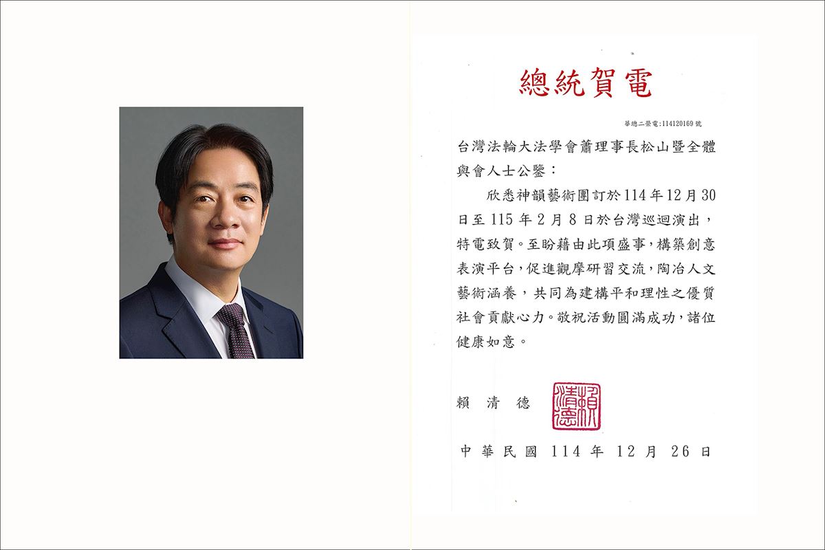 在神韵艺术团莅临台湾前夕,中华民国总统赖清德在贺电中表示,“欣悉神韵艺术团订于114年(2025年)12月30日至115年2月8日于台湾巡回演出,特电致贺。至盼借由此项盛事,构筑创意表演平台,促进观摩研习交流,陶冶人文艺术涵养,共同为建构平和理性之优质社会贡献心力。”