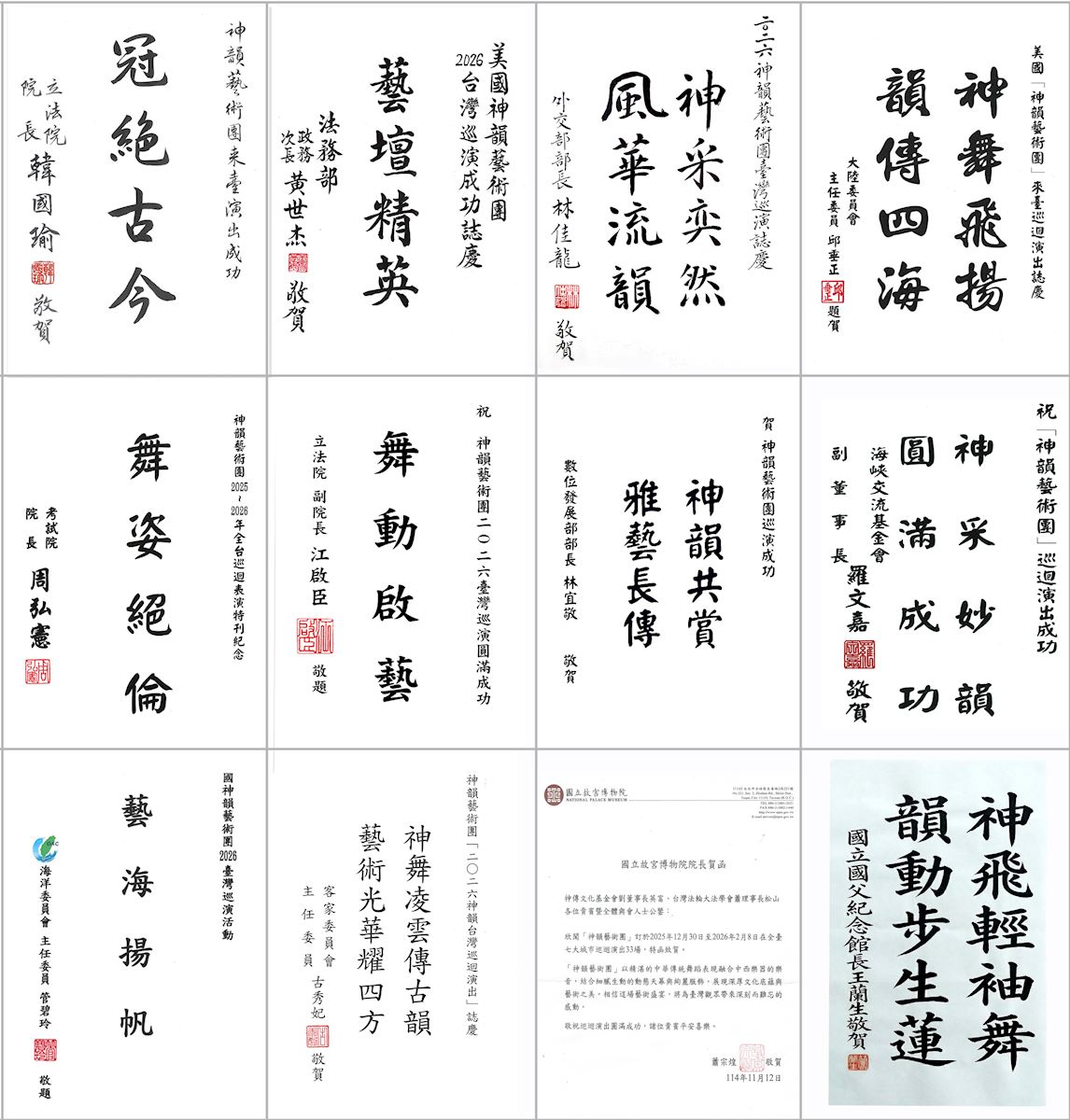 文化界方面,国立故宫博物院院长萧宗煌特地致函表示,“神韵以精湛的中华传统舞蹈,融合中西乐器的乐音,结合细腻生动的动态天幕与绚丽服饰,充分展现深厚文化底蕴与艺术之美。”国立国父纪念馆馆长王兰生也以“神飞轻袖舞 韵动步生莲”赞誉神韵的艺术表现。