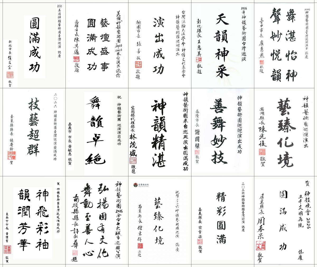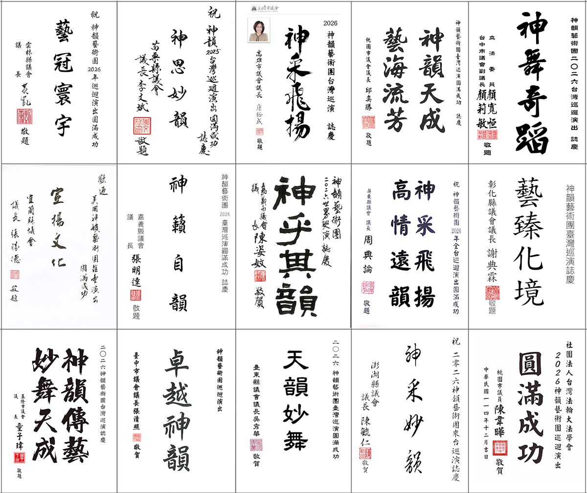 中央部会首长致贺,有立法院长、考试院长、数字发展部等十三位中央政府官员致赠贺词。其中包括立法院长韩国瑜以“冠绝古今”盛赞神韵的艺术成就;考试院院长周弘宪赞誉神韵“舞姿绝伦”;外交部长林佳龙则以神韵“神采奕然 风华流韵”形容神韵的风貌;法务部政务次长黄世杰则以“艺坛精英”致意。
