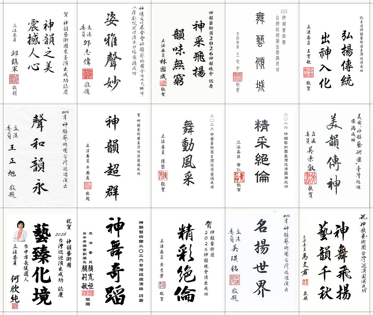 神韵“世界第一秀”的顶级口碑在台湾主流精英圈广为流传,每年均吸引大批政要名人入场观赏,诸多国会议员也纷纷致赠贺词,赞赏和迎接神韵的到来,今年计有七十位。包括立法委员王定宇赞神韵“舞艺倾城”;立法委员沈伯洋祝神韵“圆满成功”;立法委员吴思瑶赞神韵“声艺卓绝”;立法委员何欣纯赞神韵“艺臻化境”;立法委员邱志伟题赠“姿雅荠妙”;立法委员许智杰以“神传舞艺展风华,韵蕴弦音利人天”欢迎神韵;立法委员赖瑞隆赞神韵“艺海生辉”;立法委员钟佳滨赞叹神韵“神韵妙现”;立法委员苏巧慧称赞神韵“传道宏艺”。(节选)