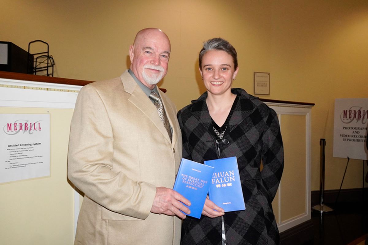 '图4:二零二五年四月一日,美国一家网站设计公司的创始人兼执行长乔治娅·克恩(Georgia King)和先生、退役空军上尉克利夫·克恩(Cliff King)在缅因州波特兰欣赏了神韵演出后,对法轮大法非常感兴趣,立即购买了法轮大法的相关书籍。(大纪元)'