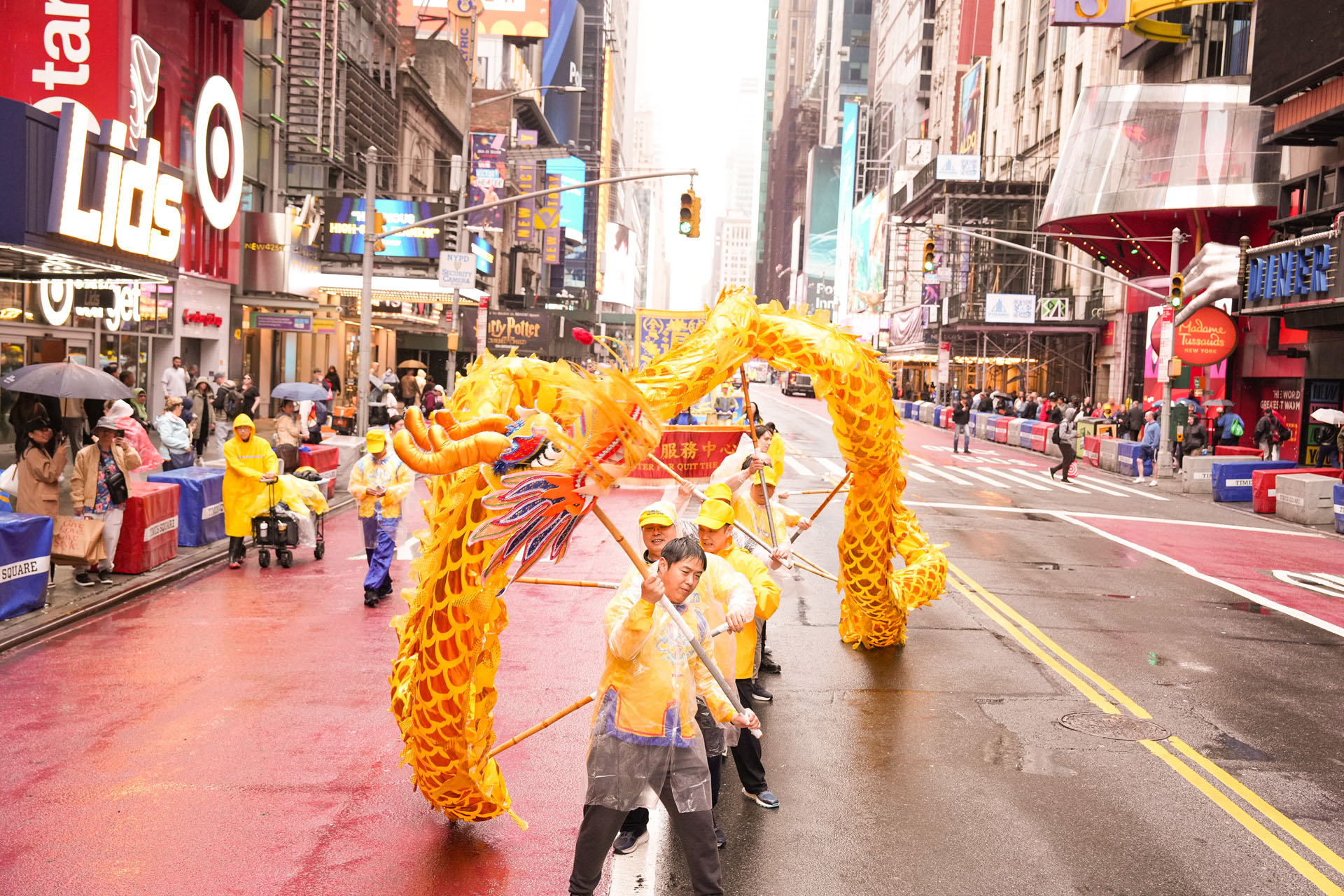 游行队伍绵延数公里。游行队伍中,五彩缤纷的巨型横幅,英文的,中英文的,中文的,在繁华热闹的曼哈顿中城,包括联合国总部、大中央车站(Grand Central)、时代广场(Times Square)等著名地标区,在美国人口最多、节奏最快、有“最强大全球城市”之称的纽约市,拉起了一道绵延数英里、充满节庆气氛的、靓丽的风景线。