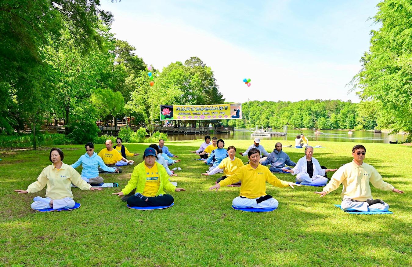 图1:二零二五年五月十日,北卡部分学员在凯瑞市的Bond Park庆祝世界法轮大法日及法轮大法洪传三十三周年,并恭祝李洪志大师生日快乐