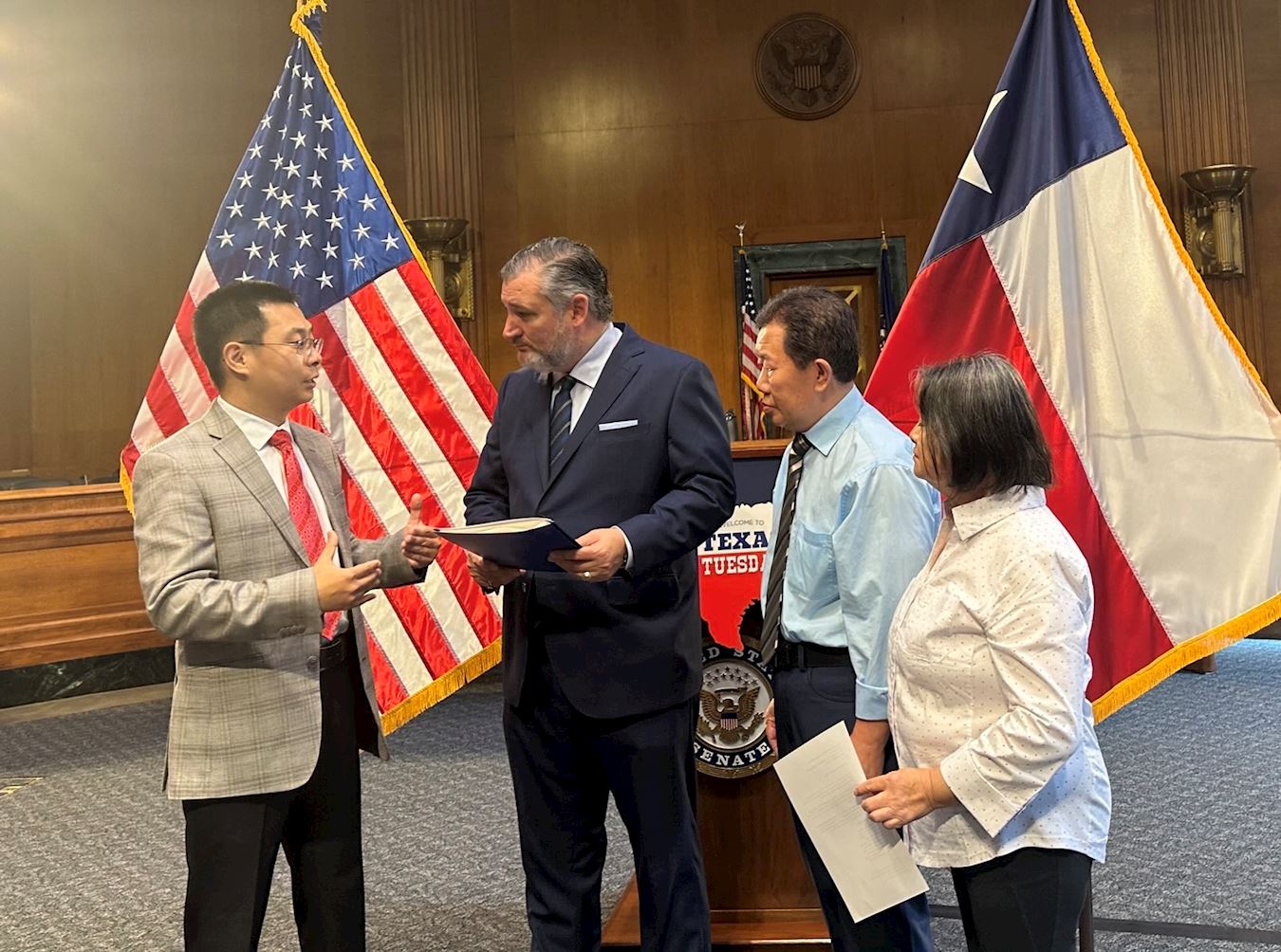 ![]() 图1~2:二零二五年九月十六日,在美国参议院德克森办公楼,来自德克萨斯州的法轮功学员宇昊和父母向泰德·克鲁兹参议员(左二)递交十封来自德州议员的支持和感谢信,感谢克鲁兹参议员在国会参议院提出《法轮功保护法案》。 |