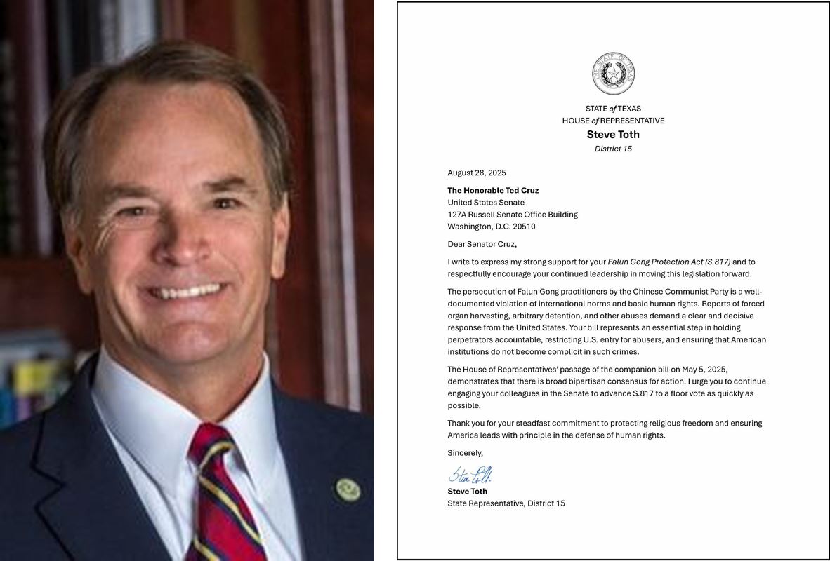 德州众议院第十五选区资深众议员史蒂夫·托特(Steve Toth)在信中说:“中共对法轮功修炼者的迫害明显违反国际准则,也是对基本人权的严重侵犯,其证据十分充足。有关活摘器官、任意拘押及其它暴行的报告,要求美国作出明确且果断的回应。您提出的法案是追究罪责、限制施暴者入境美国、并确保美国机构不会沦为此类罪行共犯的必要步骤。”