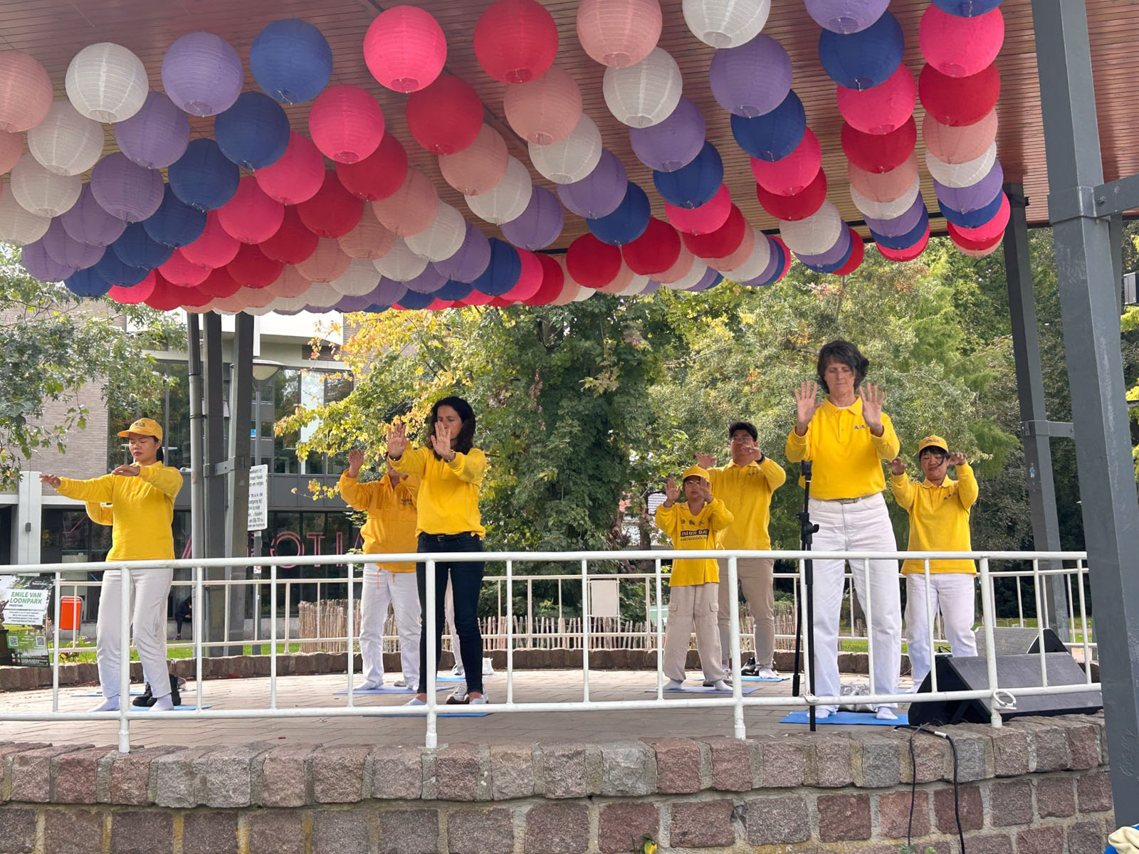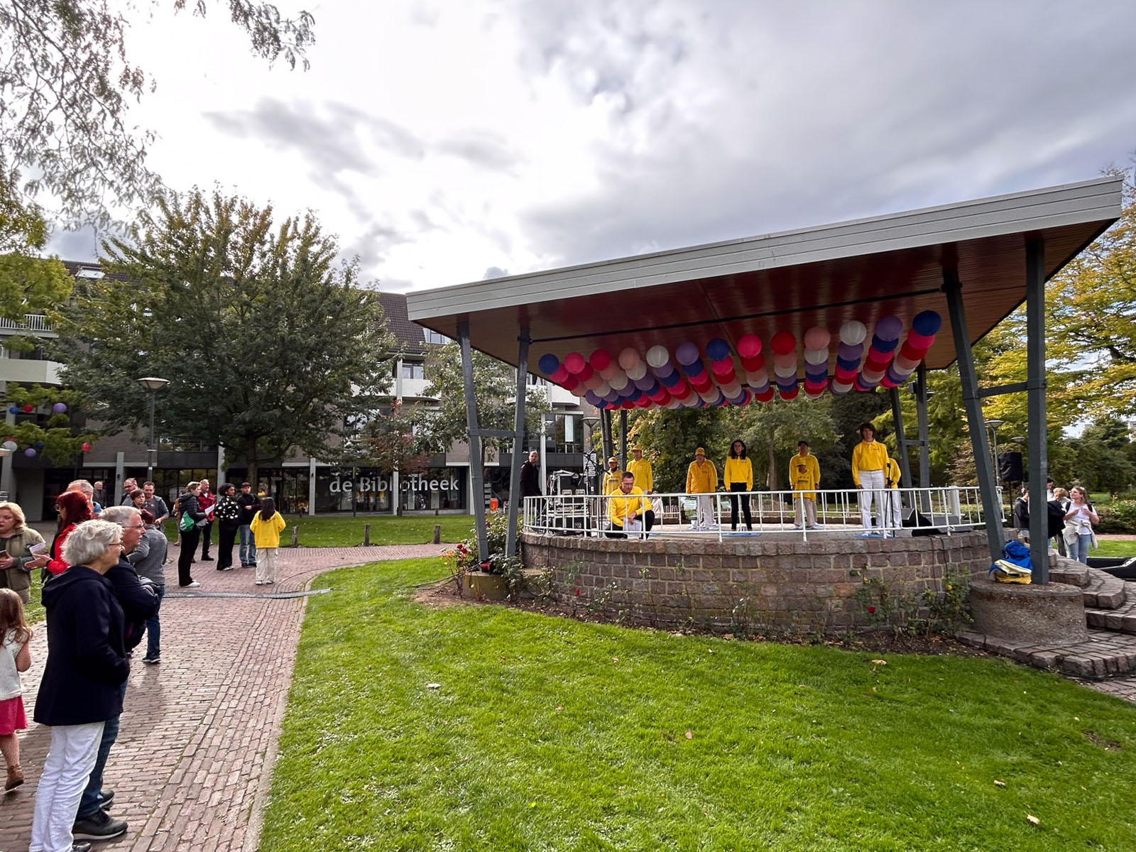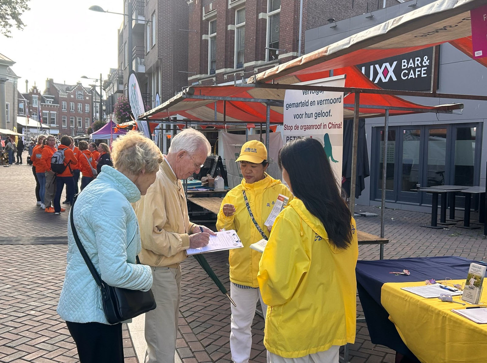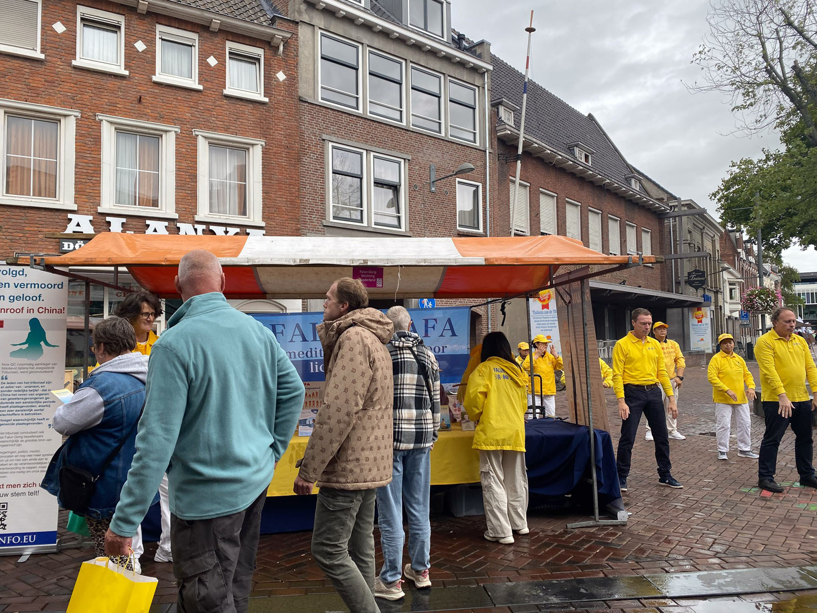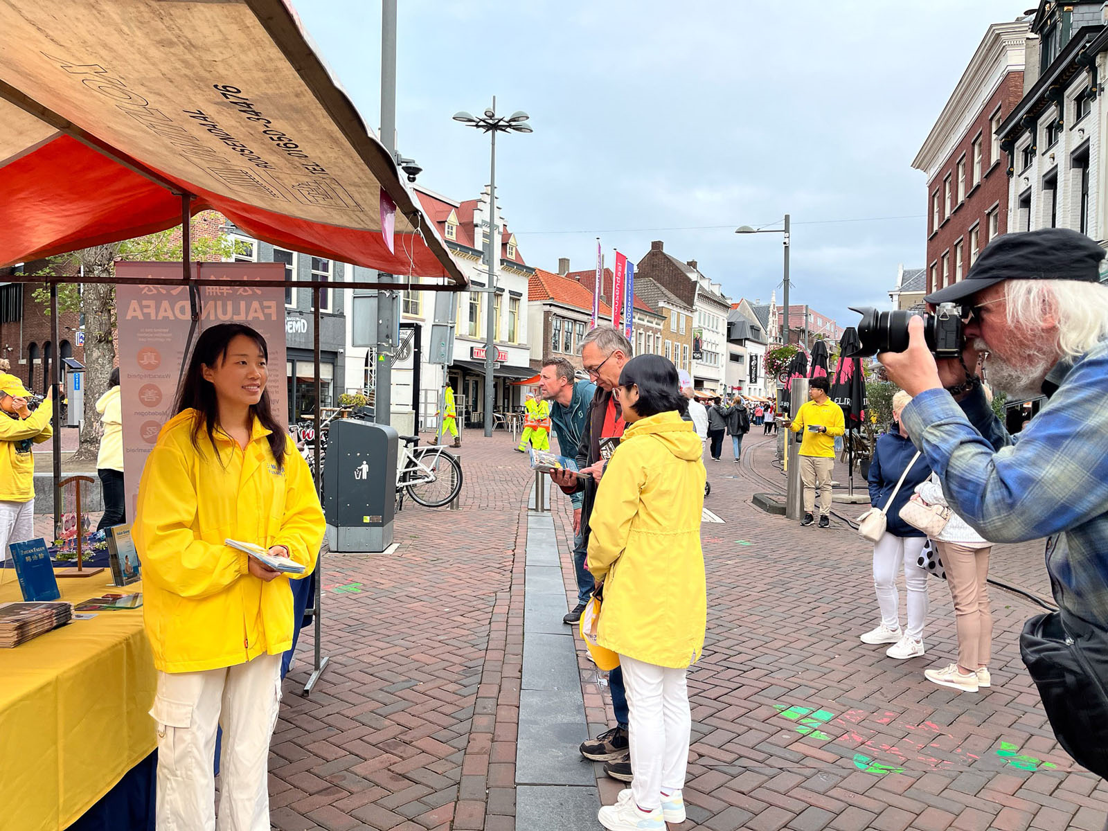 星期日中午,法轮功学员在罗森达尔市花卉市场(Bloemenmarkt)设置展位,向游客介绍法轮功的功法动作,发放传单,并揭露中共迫害法轮功真相,征集支持反迫害的签名。许多民众被吸引,有人静静地观赏;有人跟着学习炼功动作;也有人在了解真相后签名支持法轮功学员反迫害。