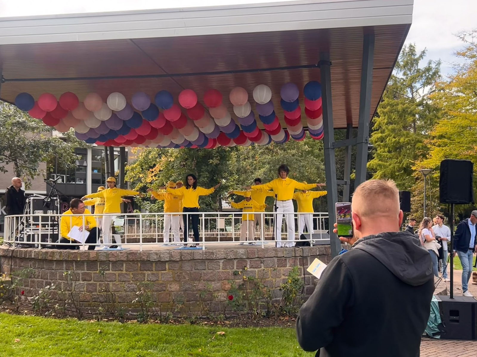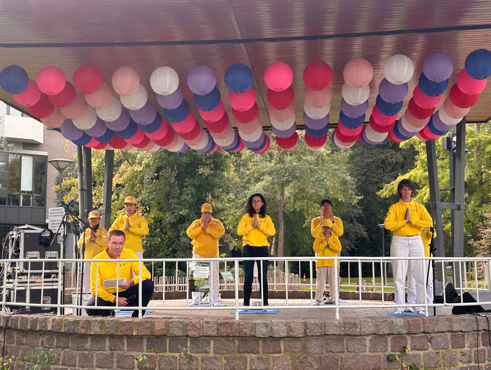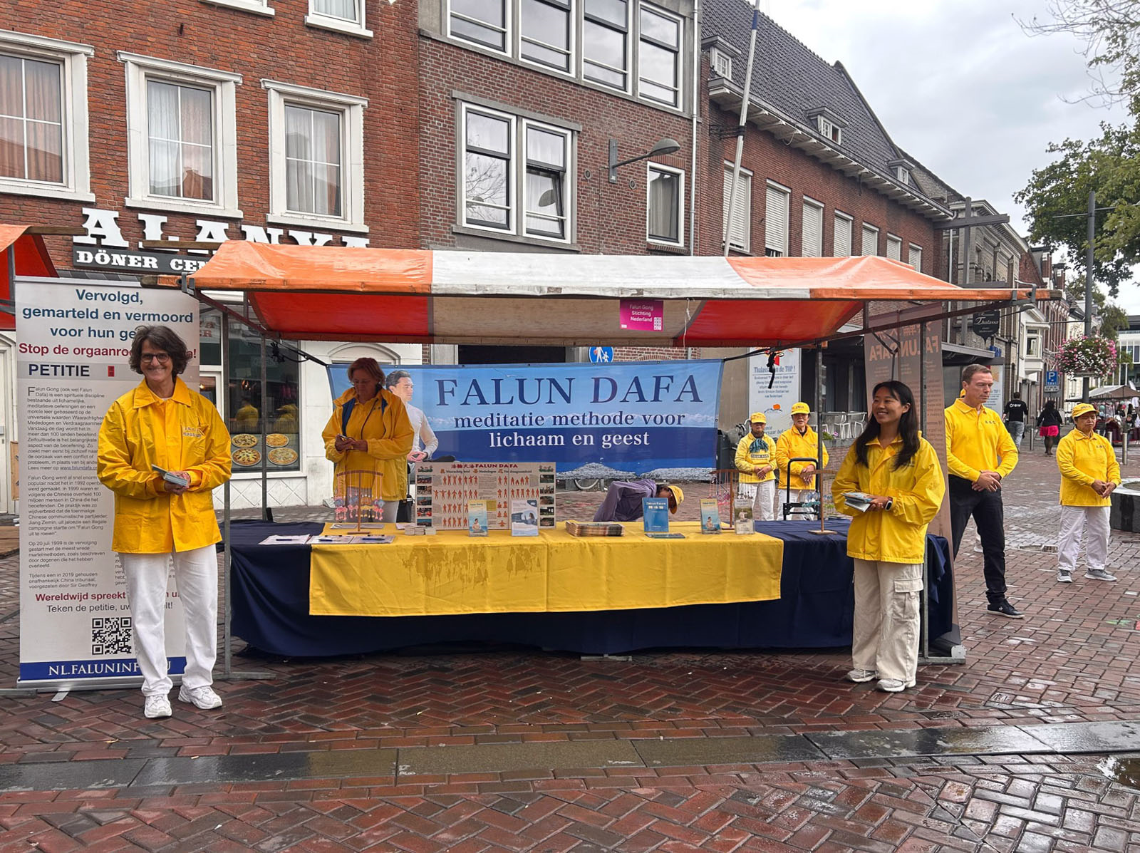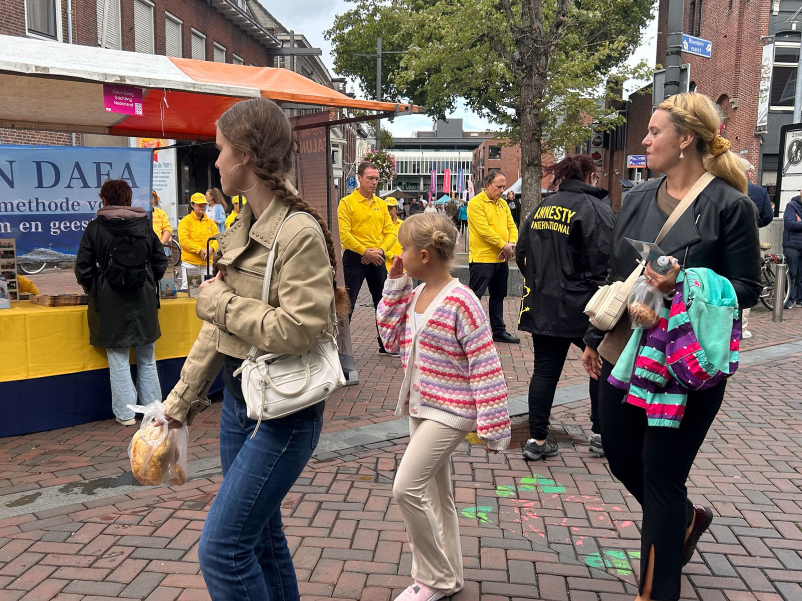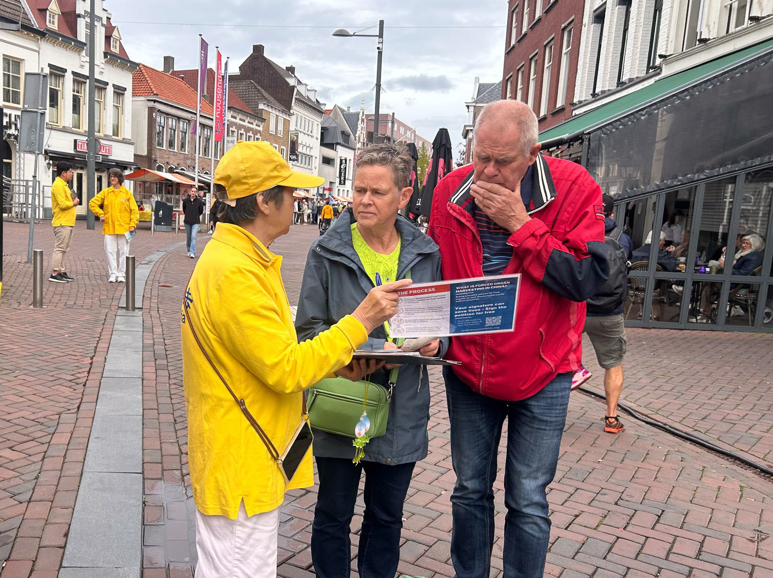 星期日中午,法轮功学员在罗森达尔市花卉市场(Bloemenmarkt)设置展位,向游客介绍法轮功的功法动作,发放传单,并揭露中共迫害法轮功真相,征集支持反迫害的签名。许多民众被吸引,有人静静地观赏;有人跟着学习炼功动作;也有人在了解真相后签名支持法轮功学员反迫害。