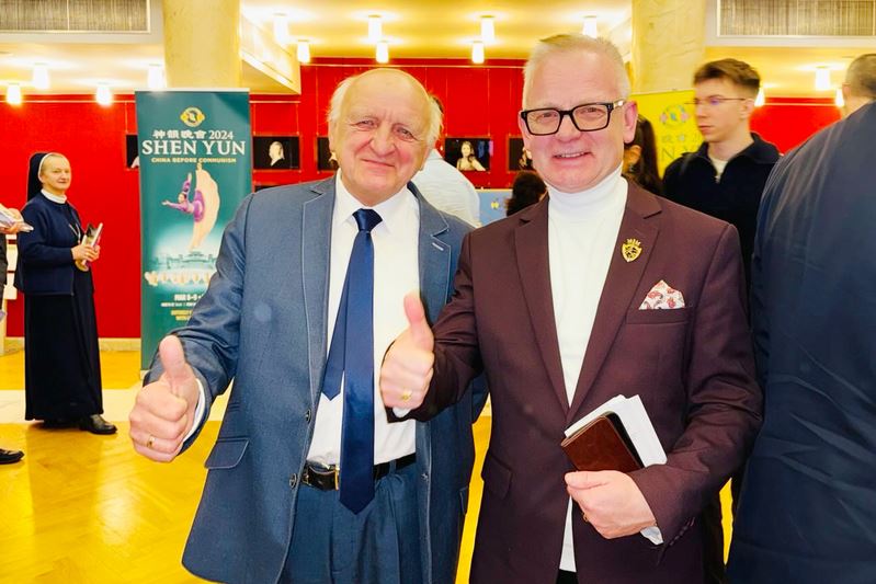 ![]() 图10:二零二六年一月十一日下午,波兰天主教神父安杰伊·齐米耶什凯维奇(Andrzej Ziemieśkiewicz,右)与朋友雷沙德·孔恰尔(Ryszard Kończal)在罗兹观赏了神韵演出。(大纪元) |