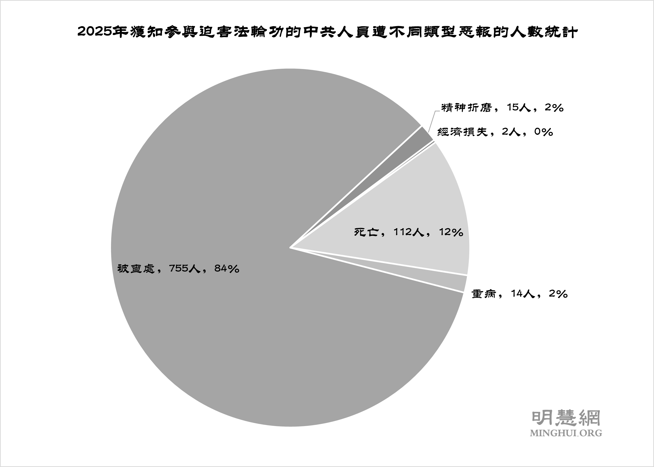 ![]() 图3:2025年获知参与迫害法轮功的中共人员遭不同类型恶报的人数统计 |