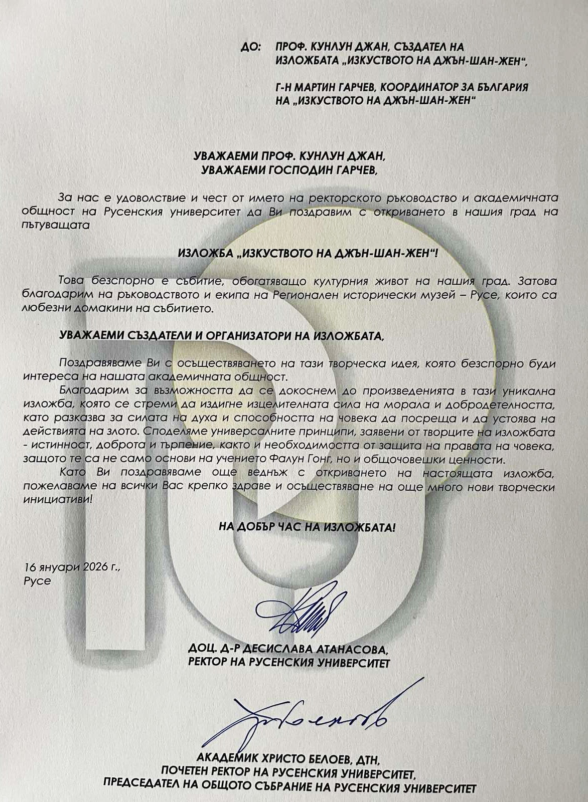 加琳娜·伊万诺娃副教授代表校方,作为鲁塞大学校长,德西斯拉娃·阿塔纳索娃副教授(Assoc. Prof. Desislava Atanasova)以及荣誉校长赫里斯托·别洛耶夫院士( the Honorary Rector, Academician Hristo Beloev, PhD.)的特使,向“真善忍国际美术作品展”协调人致贺词。