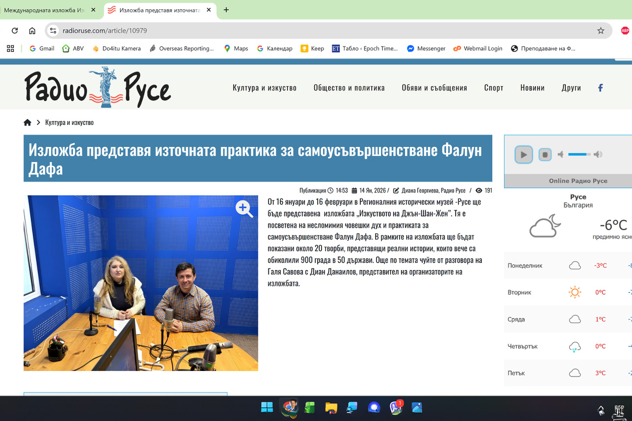 开幕前两天,地区电台“鲁塞广播”(Radio Ruse)邀请展览组织者之一迪安·达尼洛夫(Dian Danilov)作为艺术文化节目的嘉宾。他分享了作品的内涵,介绍了法轮大法,以及作为一种修炼方式的历史来源。
