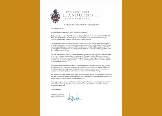 英国兰迪德诺市长安东尼·贝托拉议员向神韵英国演出主办方发来表彰信,感谢神韵艺术团为当地及英国社会所作出的卓越文化贡献。