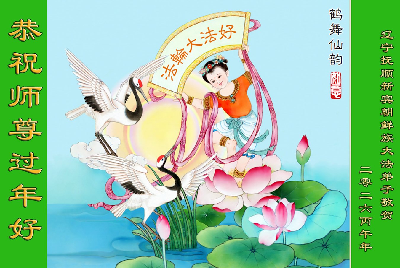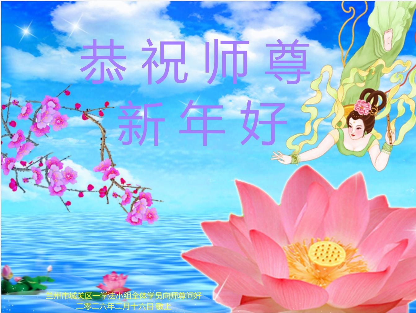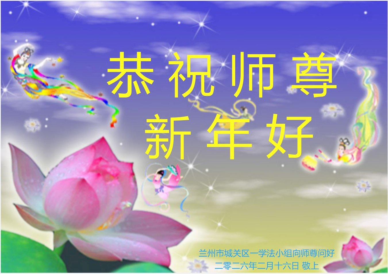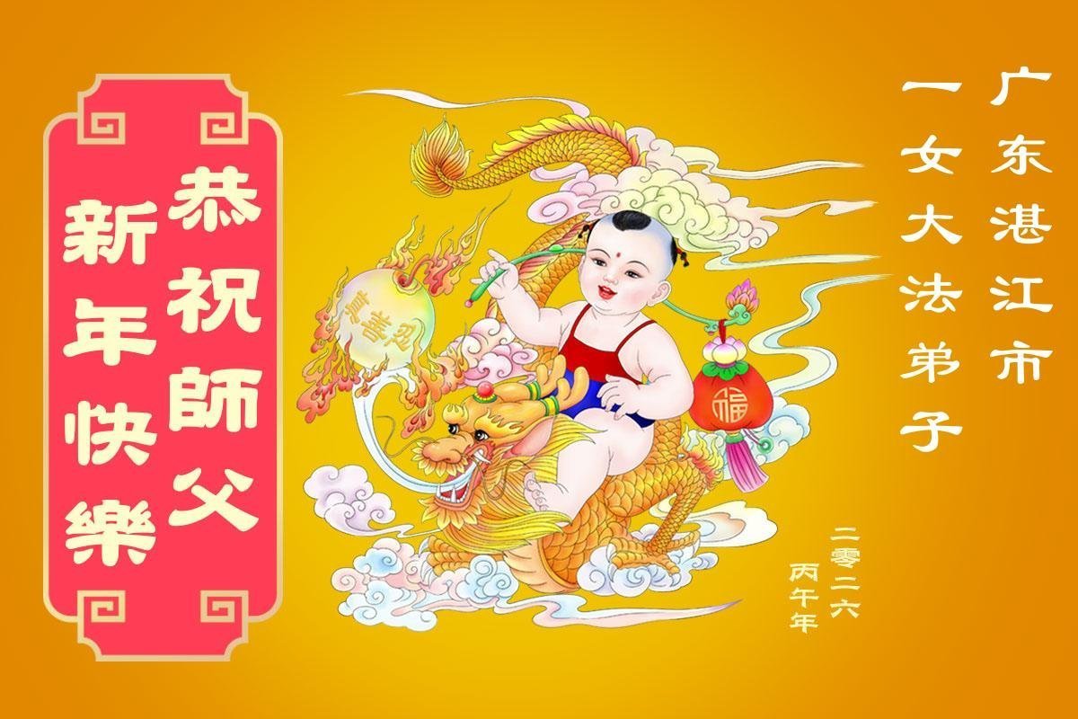 恭祝慈悲伟大的师尊过年好!弟子们成立学法小组时,想到没被迫害之前师尊当年给弟子们留下的炼功场、学法场,那壮观的景象,现在还依然历历在目,大家在一起学法、炼功、家庭和睦、走路生风,整个社会都处于和睦状态……弟子们会多学法、以法为师、共同精進、共同配合,做好三件事,圆满随师还。