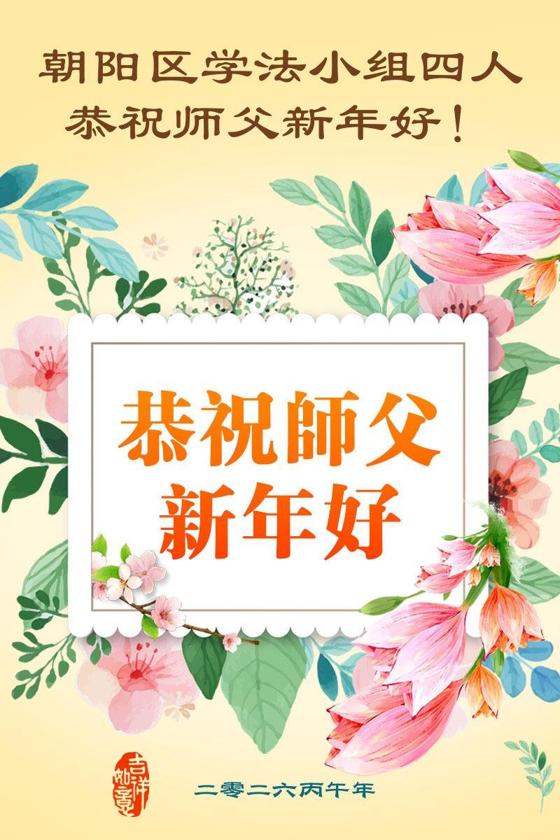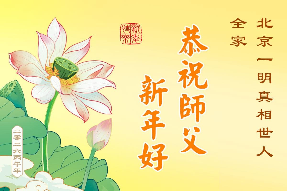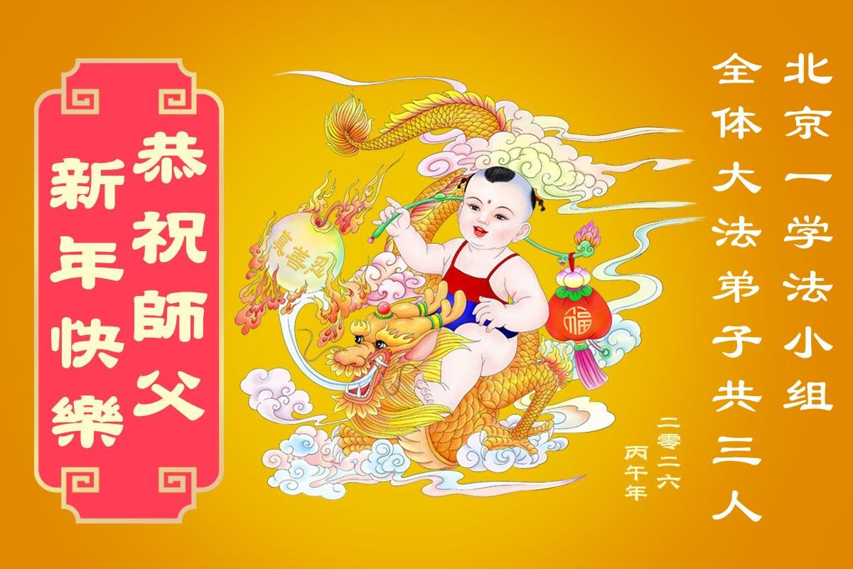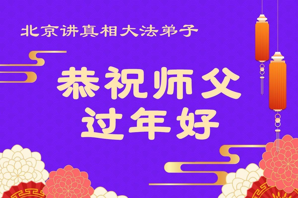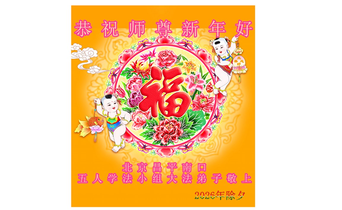 在新的一年到来之际,我们北京学法小组全体大法弟子向慈悲伟大的师尊拜年!师父您好!您辛苦了!我们有信心和决心在新的一年遵照师尊的谆谆教导,修去人心,做好三件事,学法修心向内找,讲真相,做个名副其实的大法弟子,跟师父回家。