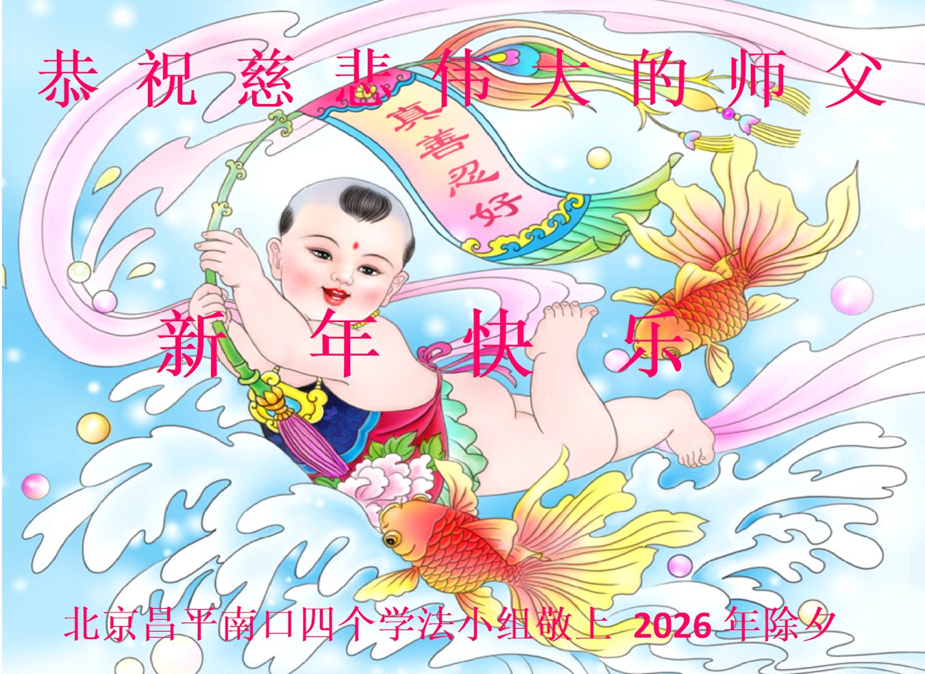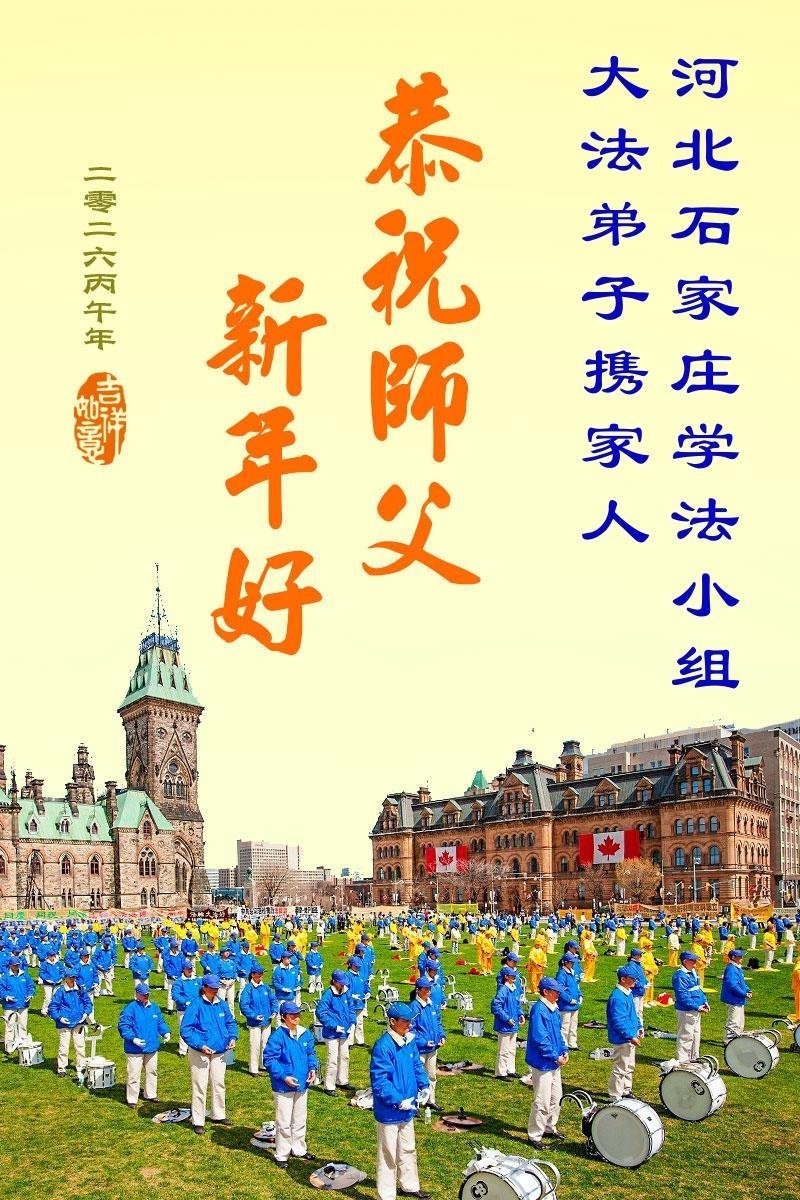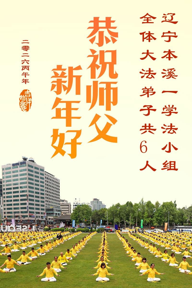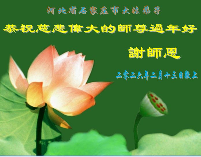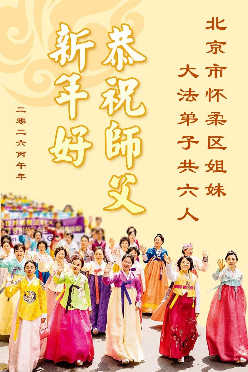 在新的一年到来之际,我们北京学法小组全体大法弟子向慈悲伟大的师尊拜年!师父您好!您辛苦了!我们有信心和决心在新的一年遵照师尊的谆谆教导,修去人心,做好三件事,学法修心向内找,讲真相,做个名副其实的大法弟子,跟师父回家。