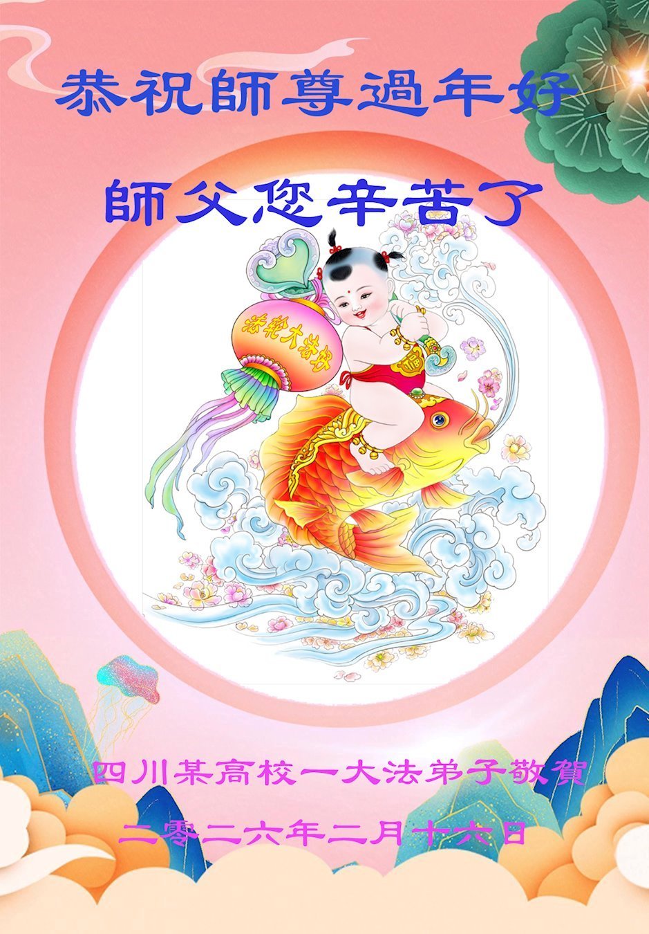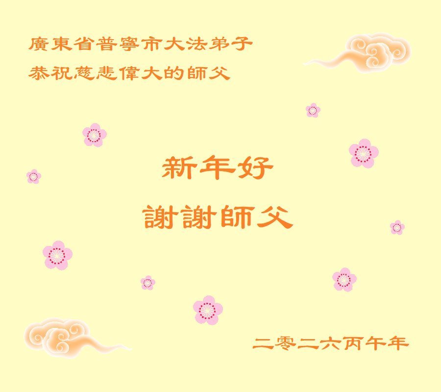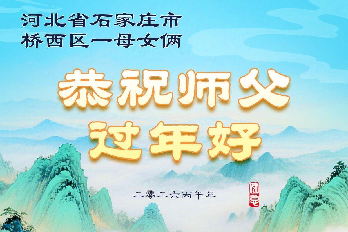 尊敬的师父,新年好!您辛苦了!多年来,您为弟子与众生付出承受的太多太多了,弟子无限感恩与珍惜!得救的众生无不欢欣鼓舞,感恩师父的慈悲救度!弟子会更加努力做好三件事,走好今后的路。愿师父多一份欣慰,少一份操劳。