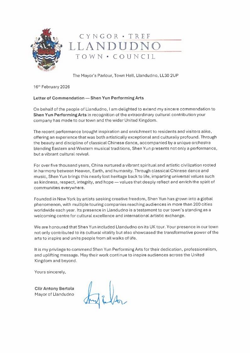 二月十六日,贝托拉市长向神韵英国演出主办方发来表彰信,感谢神韵艺术团为当地及英国社会所作出的卓越文化贡献,并对艺术团的专业精神表示高度肯定。