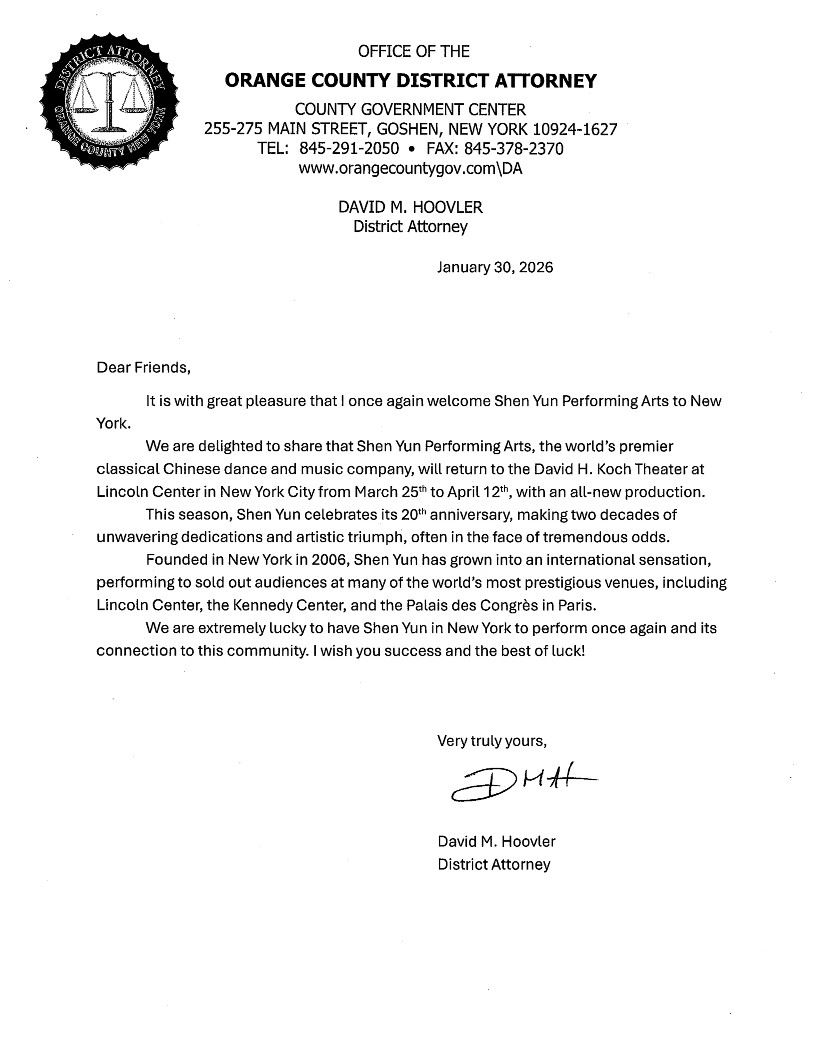 我们非常幸运能再次迎来神韵艺术团在纽约的演出,并见证其与本地社区的深厚情谊。谨祝演出圆满成功,万事如意!”