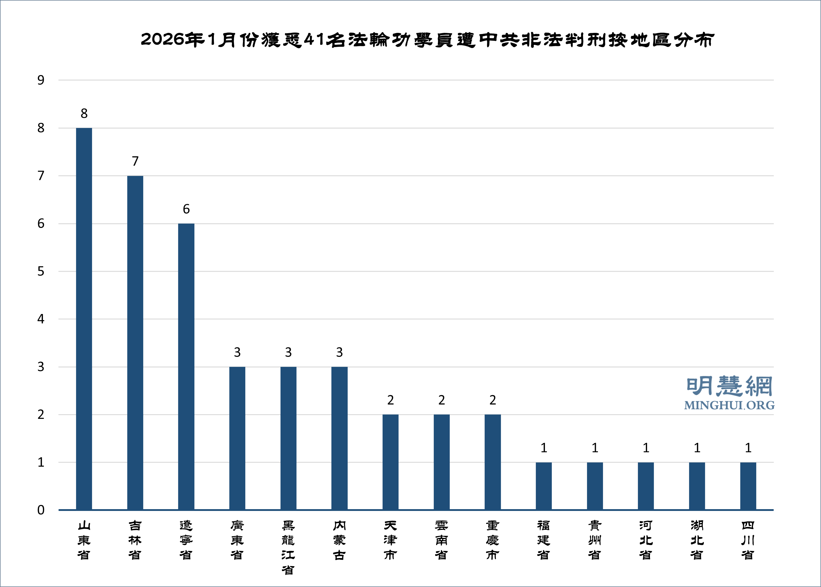 据明慧网报道统计,获知二零二六年一月份至少又有41名法轮功学员被非法判刑,年龄最大者86岁,最年轻者45岁,刑期最长6年,最短7个月。非法判刑分布于中国大陆的十四个省、自治区和直辖市。迫害最严重地区依次为:山东省8人,吉林省7人,辽宁省6人,广东省、黑龙江省、内蒙古各3人,天津市、云南省、重庆市各2人,福建省、贵州省、河北省、湖北省、四川省各1人。有年龄统计的25人。年龄段分布情况:80~90岁2人,70~80岁6人,60~70岁9人,50~60岁5人,40~50岁3人。